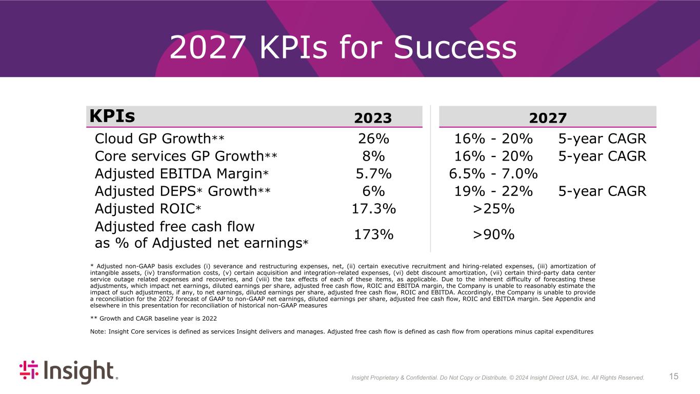 Insight Proprietary & Confidential. Do Not Copy or Distribute. © 2022 Insight Direct USA, Inc. All Rights Reserved. 154 2027 KPIs for Success KPIs 2023 2027 Cloud GP Growth** 26% 16% - 20% 5-year CAGR Core services GP Growth** 8% 16% - 20% 5-year CAGR Adjusted EBITDA Margin* 5.7% 6.5% - 7.0% Adjusted DEPS* Growth** 6% 19% - 22% 5-year CAGR Adjusted ROIC* 17.3% >25% Adjusted free cash flow as % of Adjusted net earnings* 173% >90% * Adjusted non-GAAP basis excludes (i) severance and restructuring expenses, net, (ii) certain executive recruitment and hiring-related expenses, (iii) amortization of intangible assets, (iv) transformation costs, (v) certain acquisition and integration-related expenses, (vi) debt discount amortization, (vii) certain third-party data center service outage related expenses and recoveries, and (viii) the tax effects of each of these items, as applicable. Due to the inherent difficulty of forecasting these adjustments, which impact net earnings, diluted earnings per share, adjusted free cash flow, ROIC and EBITDA margin, the Company is unable to reasonably estimate the impact of such adjustments, if any, to net earnings, diluted earnings per share, adjusted free cash flow, ROIC and EBITDA. Accordingly, the Company is unable to provide a reconciliation for the 2027 forecast of GAAP to non-GAAP net earnings, diluted earnings per share, adjusted free cash flow, ROIC and EBITDA margin. See Appendix and elsewhere in this presentation for reconciliation of historical non-GAAP measures ** Growth and CAGR baseline year is 2022 Note: Insight Core services is defined as services Insight delivers and manages. Adjusted free cash flow is defined as cash flow from operations minus capital expenditures
