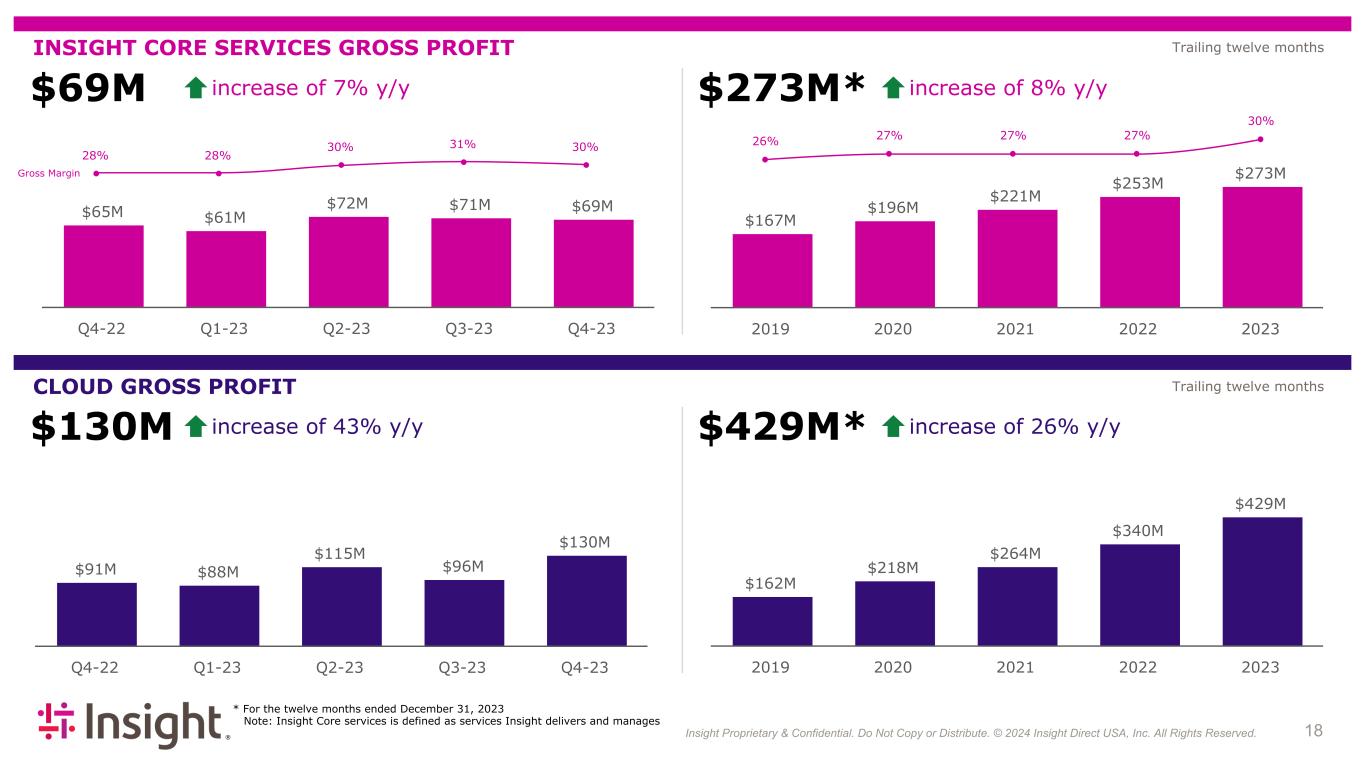Insight Proprietary & Confidential. Do Not Copy or Distribute. © 2022 Insight Direct USA, Inc. All Rights Reserved. 184 $69M INSIGHT CORE SERVICES GROSS PROFIT $130M CLOUD GROSS PROFIT increase of 43% y/y $273M* increase of 8% y/y * For the twelve months ended December 31, 2023 Note: Insight Core services is defined as services Insight delivers and manages $429M* increase of 26% y/y $65M $61M $72M $71M $69M Q4-22 Q1-23 Q2-23 Q3-23 Q4-23 $167M $196M $221M $253M $273M 2019 2020 2021 2022 2023 $91M $88M $115M $96M $130M Q4-22 Q1-23 Q2-23 Q3-23 Q4-23 $162M $218M $264M $340M $429M 2019 2020 2021 2022 2023 28% 28% 30% 31% 30% Gross Margin 26% 27% 27% 27% 30% Trailing twelve months Trailing twelve months increase of 7% y/y