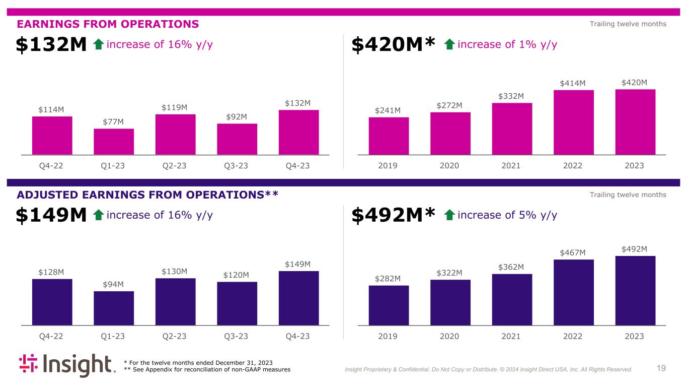 Insight Proprietary & Confidential. Do Not Copy or Distribute. © 2022 Insight Direct USA, Inc. All Rights Reserved. 194 EARNINGS FROM OPERATIONS increase of 16% y/y ADJUSTED EARNINGS FROM OPERATIONS** $420M* $128M $94M $130M $120M $149M Q4-22 Q1-23 Q2-23 Q3-23 Q4-23 $282M $322M $362M $467M $492M 2019 2020 2021 2022 2023 * For the twelve months ended December 31, 2023 ** See Appendix for reconciliation of non-GAAP measures $149M increase of 16% y/y $492M* increase of 5% y/y $132M $114M $77M $119M $92M $132M Q4-22 Q1-23 Q2-23 Q3-23 Q4-23 increase of 1% y/y $241M $272M $332M $414M $420M 2019 2020 2021 2022 2023 Trailing twelve months Trailing twelve months