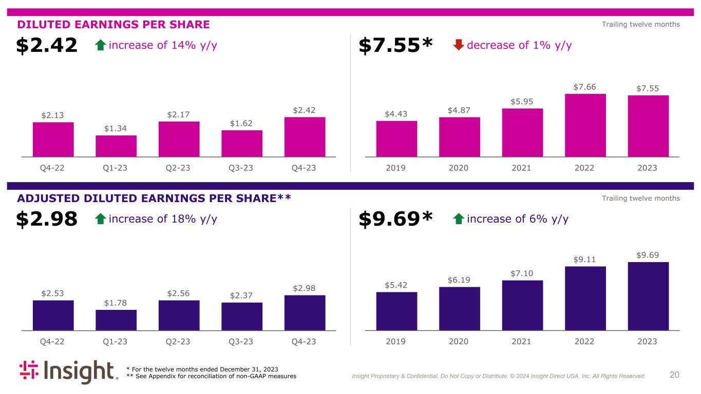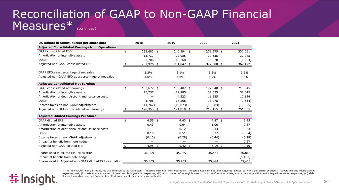 Insight Proprietary & Confidential. Do Not Copy or Distribute. © 2022 Insight Direct USA, Inc. All Rights Reserved. 304 Reconciliation of GAAP to Non-GAAP Financial Measures* Three Months Ended December 31, Twelve Months Ended December 31, US Dollars in $000s, except per share data 2023 2022 2021 2023 2022 Adjusted Consolidated Net Earnings: GAAP consolidated net earnings $ 90,608 $ 77,477 $ 62,133 $ 281,309 $ 280,608 Amortization of intangible assets 10,988 8,077 7,948 36,231 32,892 Amortization of debt discount and issuance costs — — 3,079 — — Other** 5,823 6,172 1,583 36,101 20,018 Income taxes on non-GAAP adjustments (4,287) (3,533) (3,192) (18,016) (13,306) Adjusted non-GAAP consolidated net earnings $ 103,132 $ 88,193 $ 71,551 $ 335,625 $ 320,212 Adjusted Diluted Earnings Per Share: GAAP diluted EPS $ 2.42 $ 2.13 $ 1.69 $ 7.55 $ 7.66 Amortization of intangible assets 0.29 0.22 0.22 0.97 0.90 Amortization of debt discount and issuance costs — — 0.08 — — Other 0.16 0.17 0.04 0.97 0.55 Income taxes on non-GAAP adjustments (0.11) (0.10) (0.09) (0.48) (0.36) Impact of benefit from note hedge 0.22 0.11 0.09 0.68 0.36 Adjusted non-GAAP diluted EPS $ 2.98 $ 2.53 $ 2.03 $ 9.69 $ 9.11 Shares used in diluted EPS calculation 37,513 36,336 36,871 37,241 36,620 Impact of benefit from note hedge (2,874) (1,459) (1,604) (2,619) (1,466) Shares used in Adjusted non-GAAP diluted EPS calculation 34,639 34,877 35,267 34,622 35,154 * The non-GAAP financial measures are referred to as “Adjusted”. Adjusted earnings from operations, Adjusted net earnings and Adjusted diluted earnings per share exclude (i) severance and restructuring expenses, net, (ii) certain executive recruitment and hiring-related expenses, (iii) amortization of intangible assets, (iv) transformation costs, (v) certain acquisition and integration-related expenses, (vi) debt discount amortization, (vii) certain third-party data center service outage related expenses and recoveries, and (viii) the tax effects of each of these items, as applicable ** Includes transformation costs of $2.6 million and $4.1 million for the three months ended December 31, 2023 and 2022, respectively, and $16.6 million and $12.4 million for the twelve months ended December 31, 2023 and 2022, respectively. Includes data center service outage related recoveries of $3.0 million for the three months ended December 31, 2023 and data center service outage related expenses, net of recoveries of $5.0 million for the twelve months ended December 31, 2023 with no comparable costs in the prior year periods