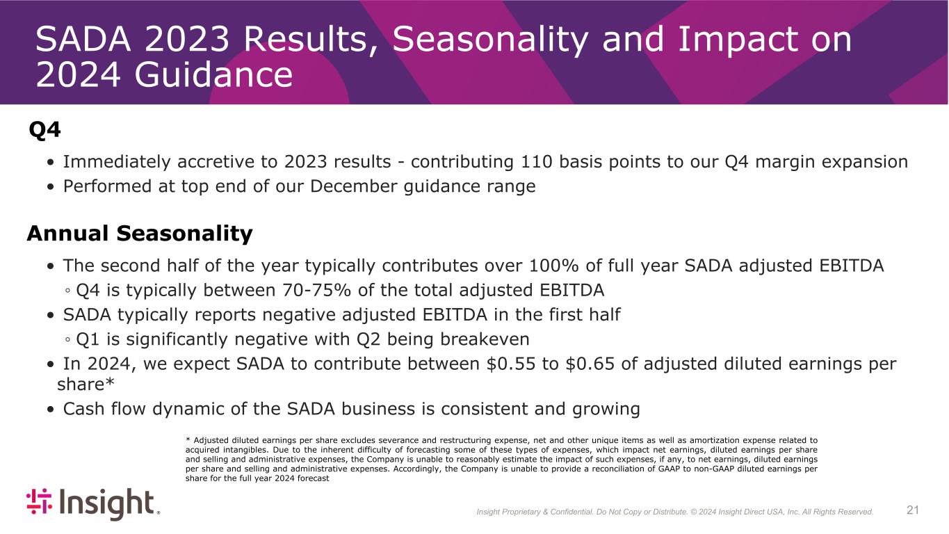 Insight Proprietary & Confidential. Do Not Copy or Distribute. © 2022 Insight Direct USA, Inc. All Rights Reserved. 214 SADA 2023 Results, Seasonality and Impact on 2024 Guidance Q4 • Immediately accretive to 2023 results - contributing 110 basis points to our Q4 margin expansion • Performed at top end of our December guidance range Annual Seasonality • The second half of the year typically contributes over 100% of full year SADA adjusted EBITDA ◦ Q4 is typically between 70-75% of the total adjusted EBITDA • SADA typically reports negative adjusted EBITDA in the first half ◦ Q1 is significantly negative with Q2 being breakeven • In 2024, we expect SADA to contribute between $0.55 to $0.65 of adjusted diluted earnings per share* • Cash flow dynamic of the SADA business is consistent and growing * Adjusted diluted earnings per share excludes severance and restructuring expense, net and other unique items as well as amortization expense related to acquired intangibles. Due to the inherent difficulty of forecasting some of these types of expenses, which impact net earnings, diluted earnings per share and selling and administrative expenses, the Company is unable to reasonably estimate the impact of such expenses, if any, to net earnings, diluted earnings per share and selling and administrative expenses. Accordingly, the Company is unable to provide a reconciliation of GAAP to non-GAAP diluted earnings per share for the full year 2024 forecast