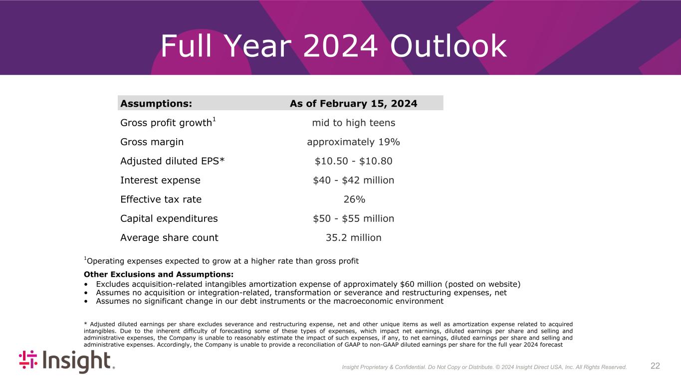 Insight Proprietary & Confidential. Do Not Copy or Distribute. © 2022 Insight Direct USA, Inc. All Rights Reserved. 224 Full Year 2024 Outlook Assumptions: As of February 15, 2024 Gross profit growth1 mid to high teens Gross margin approximately 19% Adjusted diluted EPS* $10.50 - $10.80 Interest expense $40 - $42 million Effective tax rate 26% Capital expenditures $50 - $55 million Average share count 35.2 million Other Exclusions and Assumptions: • Excludes acquisition-related intangibles amortization expense of approximately $60 million (posted on website) • Assumes no acquisition or integration-related, transformation or severance and restructuring expenses, net • Assumes no significant change in our debt instruments or the macroeconomic environment * Adjusted diluted earnings per share excludes severance and restructuring expense, net and other unique items as well as amortization expense related to acquired intangibles. Due to the inherent difficulty of forecasting some of these types of expenses, which impact net earnings, diluted earnings per share and selling and administrative expenses, the Company is unable to reasonably estimate the impact of such expenses, if any, to net earnings, diluted earnings per share and selling and administrative expenses. Accordingly, the Company is unable to provide a reconciliation of GAAP to non-GAAP diluted earnings per share for the full year 2024 forecast 1Operating expenses expected to grow at a higher rate than gross profit