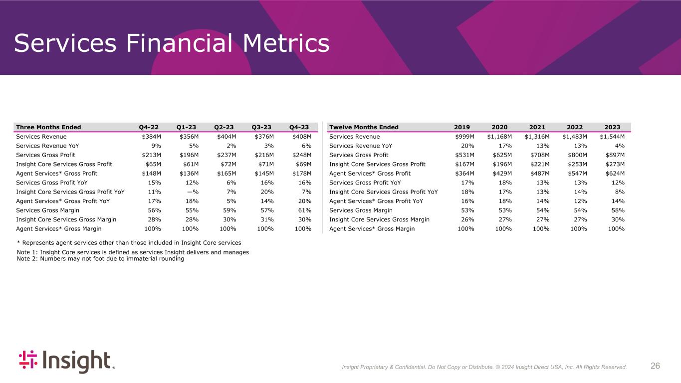 Insight Proprietary & Confidential. Do Not Copy or Distribute. © 2022 Insight Direct USA, Inc. All Rights Reserved. 264 Services Financial Metrics Three Months Ended Q4-22 Q1-23 Q2-23 Q3-23 Q4-23 Services Revenue $384M $356M $404M $376M $408M Services Revenue YoY 9% 5% 2% 3% 6% Services Gross Profit $213M $196M $237M $216M $248M Insight Core Services Gross Profit $65M $61M $72M $71M $69M Agent Services* Gross Profit $148M $136M $165M $145M $178M Services Gross Profit YoY 15% 12% 6% 16% 16% Insight Core Services Gross Profit YoY 11% —% 7% 20% 7% Agent Services* Gross Profit YoY 17% 18% 5% 14% 20% Services Gross Margin 56% 55% 59% 57% 61% Insight Core Services Gross Margin 28% 28% 30% 31% 30% Agent Services* Gross Margin 100% 100% 100% 100% 100% Twelve Months Ended 2019 2020 2021 2022 2023 Services Revenue $999M $1,168M $1,316M $1,483M $1,544M Services Revenue YoY 20% 17% 13% 13% 4% Services Gross Profit $531M $625M $708M $800M $897M Insight Core Services Gross Profit $167M $196M $221M $253M $273M Agent Services* Gross Profit $364M $429M $487M $547M $624M Services Gross Profit YoY 17% 18% 13% 13% 12% Insight Core Services Gross Profit YoY 18% 17% 13% 14% 8% Agent Services* Gross Profit YoY 16% 18% 14% 12% 14% Services Gross Margin 53% 53% 54% 54% 58% Insight Core Services Gross Margin 26% 27% 27% 27% 30% Agent Services* Gross Margin 100% 100% 100% 100% 100% * Represents agent services other than those included in Insight Core services Note 1: Insight Core services is defined as services Insight delivers and manages Note 2: Numbers may not foot due to immaterial rounding