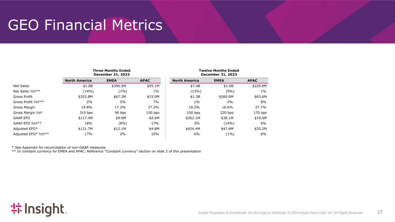 Insight Proprietary & Confidential. Do Not Copy or Distribute. © 2022 Insight Direct USA, Inc. All Rights Reserved. 274 * See Appendix for reconciliation of non-GAAP measures ** In constant currency for EMEA and APAC. Reference “Constant currency” section on slide 2 of this presentation GEO Financial Metrics Twelve Months Ended December 31, 2023 North America EMEA APAC $7.4B $1.6B $229.8M (13%) (9%) 1% $1.3B $260.0M $63.6M 1% 4% 8% 18.2% 16.6% 27.7% 250 bps 220 bps 170 bps $362.1M $38.1M $19.6M 3% (14%) 6% $424.4M $47.6M $20.2M 6% (1%) 6% Three Months Ended December 31, 2023 North America EMEA APAC Net Sales $1.8B $390.5M $55.1M Net Sales YoY** (14%) (1%) 1% Gross Profit $353.8M $67.3M $15.0M Gross Profit YoY** 2% 5% 7% Gross Margin 19.8% 17.2% 27.2% Gross Margin YoY 310 bps 90 bps 150 bps GAAP EFO $117.4M $9.9M $4.6M GAAP EFO YoY** 18% (8%) 17% Adjusted EFO* $131.7M $12.1M $4.8M Adjusted EFO* YoY** 17% 2% 16%