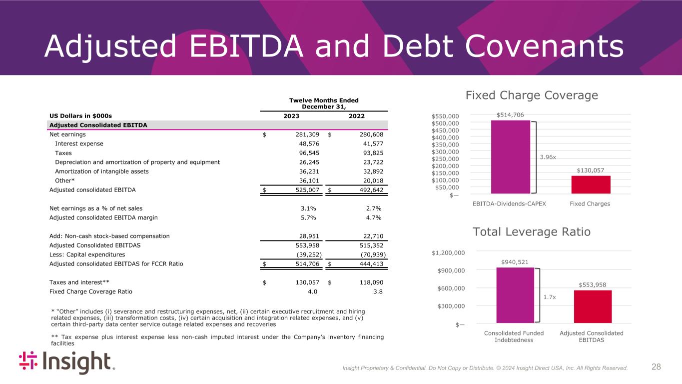 Insight Proprietary & Confidential. Do Not Copy or Distribute. © 2022 Insight Direct USA, Inc. All Rights Reserved. 284 Adjusted EBITDA and Debt Covenants Twelve Months Ended December 31, US Dollars in $000s 2023 2022 Adjusted Consolidated EBITDA Net earnings $ 281,309 $ 280,608 Interest expense 48,576 41,577 Taxes 96,545 93,825 Depreciation and amortization of property and equipment 26,245 23,722 Amortization of intangible assets 36,231 32,892 Other* 36,101 20,018 Adjusted consolidated EBITDA $ 525,007 $ 492,642 Net earnings as a % of net sales 3.1 % 2.7 % Adjusted consolidated EBITDA margin 5.7 % 4.7 % Add: Non-cash stock-based compensation 28,951 22,710 Adjusted Consolidated EBITDAS 553,958 515,352 Less: Capital expenditures (39,252) (70,939) Adjusted consolidated EBITDAS for FCCR Ratio $ 514,706 $ 444,413 Taxes and interest** $ 130,057 $ 118,090 Fixed Charge Coverage Ratio 4.0 3.8 Fixed Charge Coverage $514,706 $130,057 EBITDA-Dividends-CAPEX Fixed Charges $— $50,000 $100,000 $150,000 $200,000 $250,000 $300,000 $350,000 $400,000 $450,000 $500,000 $550,000 Total Leverage Ratio $940,521 $553,958 Consolidated Funded Indebtedness Adjusted Consolidated EBITDAS $— $300,000 $600,000 $900,000 $1,200,000 * “Other” includes (i) severance and restructuring expenses, net, (ii) certain executive recruitment and hiring related expenses, (iii) transformation costs, (iv) certain acquisition and integration related expenses, and (v) certain third-party data center service outage related expenses and recoveries ** Tax expense plus interest expense less non-cash imputed interest under the Company’s inventory financing facilities 3.96x 1.7x