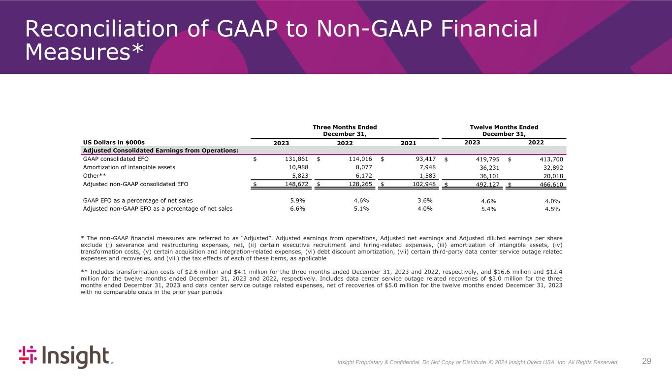 Insight Proprietary & Confidential. Do Not Copy or Distribute. © 2022 Insight Direct USA, Inc. All Rights Reserved. 294 Reconciliation of GAAP to Non-GAAP Financial Measures* Three Months Ended December 31, Twelve Months Ended December 31, US Dollars in $000s 2023 2022 2021 2023 2022 Adjusted Consolidated Earnings from Operations: GAAP consolidated EFO $ 131,861 $ 114,016 $ 93,417 $ 419,795 $ 413,700 Amortization of intangible assets 10,988 8,077 7,948 36,231 32,892 Other** 5,823 6,172 1,583 36,101 20,018 Adjusted non-GAAP consolidated EFO $ 148,672 $ 128,265 $ 102,948 $ 492,127 $ 466,610 GAAP EFO as a percentage of net sales 5.9 % 4.6 % 3.6 % 4.6 % 4.0 % Adjusted non-GAAP EFO as a percentage of net sales 6.6 % 5.1 % 4.0 % 5.4 % 4.5 % * The non-GAAP financial measures are referred to as “Adjusted”. Adjusted earnings from operations, Adjusted net earnings and Adjusted diluted earnings per share exclude (i) severance and restructuring expenses, net, (ii) certain executive recruitment and hiring-related expenses, (iii) amortization of intangible assets, (iv) transformation costs, (v) certain acquisition and integration-related expenses, (vi) debt discount amortization, (vii) certain third-party data center service outage related expenses and recoveries, and (viii) the tax effects of each of these items, as applicable ** Includes transformation costs of $2.6 million and $4.1 million for the three months ended December 31, 2023 and 2022, respectively, and $16.6 million and $12.4 million for the twelve months ended December 31, 2023 and 2022, respectively. Includes data center service outage related recoveries of $3.0 million for the three months ended December 31, 2023 and data center service outage related expenses, net of recoveries of $5.0 million for the twelve months ended December 31, 2023 with no comparable costs in the prior year periods
