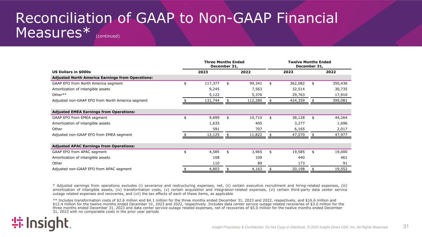 Insight Proprietary & Confidential. Do Not Copy or Distribute. © 2022 Insight Direct USA, Inc. All Rights Reserved. 314 Reconciliation of GAAP to Non-GAAP Financial Measures* (continued) Three Months Ended December 31, Twelve Months Ended December 31, US Dollars in $000s 2023 2022 2023 2022 Adjusted North America Earnings from Operations: GAAP EFO from North America segment $ 117,377 $ 99,341 $ 362,082 $ 350,436 Amortization of intangible assets 9,245 7,563 32,514 30,735 Other** 5,122 5,376 29,763 17,910 Adjusted non-GAAP EFO from North America segment $ 131,744 $ 112,280 $ 424,359 $ 399,081 Adjusted EMEA Earnings from Operations: GAAP EFO from EMEA segment $ 9,899 $ 10,710 $ 38,128 $ 44,264 Amortization of intangible assets 1,635 405 3,277 1,696 Other 591 707 6,165 2,017 Adjusted non-GAAP EFO from EMEA segment $ 12,125 $ 11,822 $ 47,570 $ 47,977 Adjusted APAC Earnings from Operations: GAAP EFO from APAC segment $ 4,585 $ 3,965 $ 19,585 $ 19,000 Amortization of intangible assets 108 109 440 461 Other 110 89 173 91 Adjusted non-GAAP EFO from APAC segment $ 4,803 $ 4,163 $ 20,198 $ 19,552 * Adjusted earnings from operations excludes (i) severance and restructuring expenses, net, (ii) certain executive recruitment and hiring-related expenses, (iii) amortization of intangible assets, (iv) transformation costs, (v) certain acquisition and integration-related expenses, (vi) certain third-party data center service outage related expenses and recoveries, and (vii) the tax effects of each of these items, as applicable ** Includes transformation costs of $2.6 million and $4.1 million for the three months ended December 31, 2023 and 2022, respectively, and $16.6 million and $12.4 million for the twelve months ended December 31, 2023 and 2022, respectively. Includes data center service outage related recoveries of $3.0 million for the three months ended December 31, 2023 and data center service outage related expenses, net of recoveries of $5.0 million for the twelve months ended December 31, 2023 with no comparable costs in the prior year periods