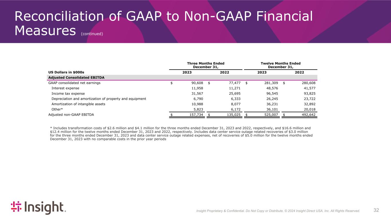 Insight Proprietary & Confidential. Do Not Copy or Distribute. © 2022 Insight Direct USA, Inc. All Rights Reserved. 324 Three Months Ended Twelve Months Ended December 31, December 31, US Dollars in $000s 2023 2022 2023 2022 Adjusted Consolidated EBITDA GAAP consolidated net earnings $ 90,608 $ 77,477 $ 281,309 $ 280,608 Interest expense 11,958 11,271 48,576 41,577 Income tax expense 31,567 25,695 96,545 93,825 Depreciation and amortization of property and equipment 6,790 6,333 26,245 23,722 Amortization of intangible assets 10,988 8,077 36,231 32,892 Other* 5,823 6,172 36,101 20,018 Adjusted non-GAAP EBITDA $ 157,734 $ 135,025 $ 525,007 $ 492,642 * Includes transformation costs of $2.6 million and $4.1 million for the three months ended December 31, 2023 and 2022, respectively, and $16.6 million and $12.4 million for the twelve months ended December 31, 2023 and 2022, respectively. Includes data center service outage related recoveries of $3.0 million for the three months ended December 31, 2023 and data center service outage related expenses, net of recoveries of $5.0 million for the twelve months ended December 31, 2023 with no comparable costs in the prior year periods Reconciliation of GAAP to Non-GAAP Financial Measures (continued)