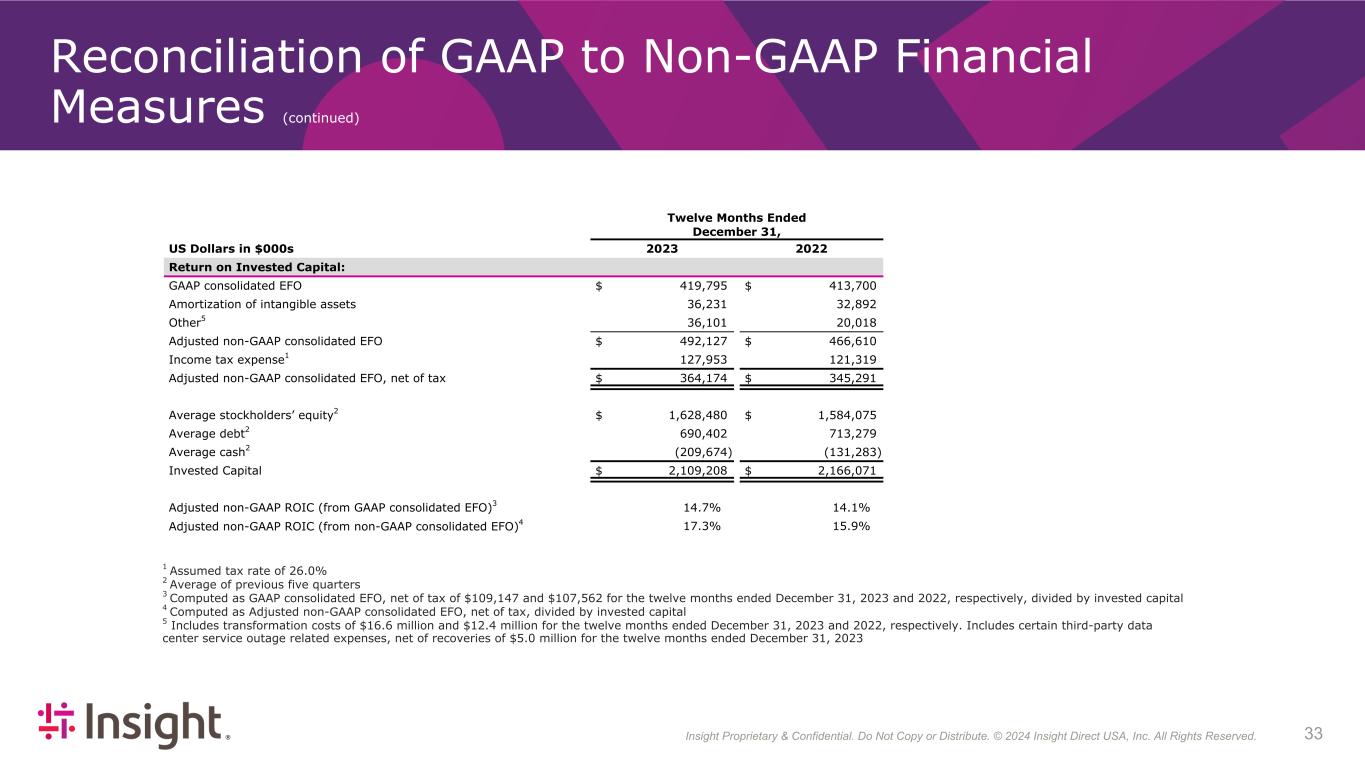 Insight Proprietary & Confidential. Do Not Copy or Distribute. © 2022 Insight Direct USA, Inc. All Rights Reserved. 334 Reconciliation of GAAP to Non-GAAP Financial Measures (continued) 1 Assumed tax rate of 26.0% 2 Average of previous five quarters 3 Computed as GAAP consolidated EFO, net of tax of $109,147 and $107,562 for the twelve months ended December 31, 2023 and 2022, respectively, divided by invested capital 4 Computed as Adjusted non-GAAP consolidated EFO, net of tax, divided by invested capital 5 Includes transformation costs of $16.6 million and $12.4 million for the twelve months ended December 31, 2023 and 2022, respectively. Includes certain third-party data center service outage related expenses, net of recoveries of $5.0 million for the twelve months ended December 31, 2023 Twelve Months Ended December 31, US Dollars in $000s 2023 2022 Return on Invested Capital: GAAP consolidated EFO $ 419,795 $ 413,700 Amortization of intangible assets 36,231 32,892 Other5 36,101 20,018 Adjusted non-GAAP consolidated EFO $ 492,127 $ 466,610 Income tax expense1 127,953 121,319 Adjusted non-GAAP consolidated EFO, net of tax $ 364,174 $ 345,291 Average stockholders’ equity2 $ 1,628,480 $ 1,584,075 Average debt2 690,402 713,279 Average cash2 (209,674) (131,283) Invested Capital $ 2,109,208 $ 2,166,071 Adjusted non-GAAP ROIC (from GAAP consolidated EFO)3 14.7 % 14.1 % Adjusted non-GAAP ROIC (from non-GAAP consolidated EFO)4 17.3 % 15.9 %