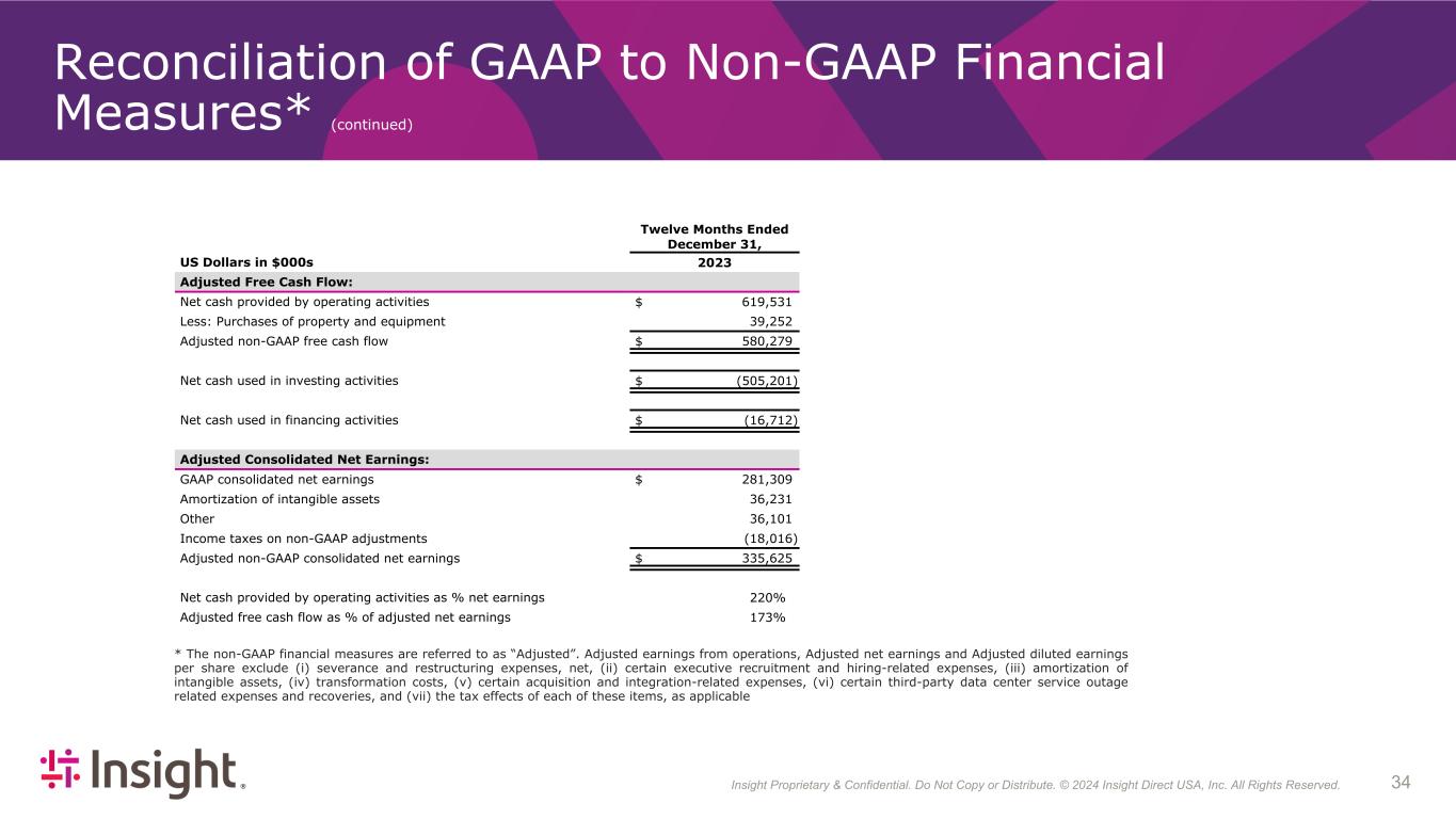 Insight Proprietary & Confidential. Do Not Copy or Distribute. © 2022 Insight Direct USA, Inc. All Rights Reserved. 344 Reconciliation of GAAP to Non-GAAP Financial Measures* (continued) Twelve Months Ended December 31, US Dollars in $000s 2023 Adjusted Free Cash Flow: Net cash provided by operating activities $ 619,531 Less: Purchases of property and equipment 39,252 Adjusted non-GAAP free cash flow $ 580,279 Net cash used in investing activities $ (505,201) Net cash used in financing activities $ (16,712) Adjusted Consolidated Net Earnings: GAAP consolidated net earnings $ 281,309 Amortization of intangible assets 36,231 Other 36,101 Income taxes on non-GAAP adjustments (18,016) Adjusted non-GAAP consolidated net earnings $ 335,625 Net cash provided by operating activities as % net earnings 220 % Adjusted free cash flow as % of adjusted net earnings 173 % * The non-GAAP financial measures are referred to as “Adjusted”. Adjusted earnings from operations, Adjusted net earnings and Adjusted diluted earnings per share exclude (i) severance and restructuring expenses, net, (ii) certain executive recruitment and hiring-related expenses, (iii) amortization of intangible assets, (iv) transformation costs, (v) certain acquisition and integration-related expenses, (vi) certain third-party data center service outage related expenses and recoveries, and (vii) the tax effects of each of these items, as applicable