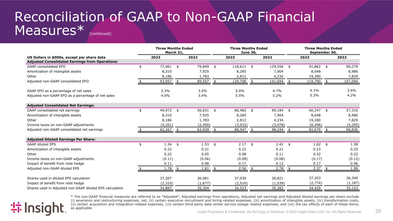 Insight Proprietary & Confidential. Do Not Copy or Distribute. © 2022 Insight Direct USA, Inc. All Rights Reserved. 354 Reconciliation of GAAP to Non-GAAP Financial Measures* (continued) Three Months Ended Three Months Ended Three Months Ended March 31, June 30, September 30, US Dollars in $000s, except per share data 2023 2022 2023 2022 2023 2022 Adjusted Consolidated Earnings from Operations: GAAP consolidated EFO $ 77,461 $ 79,849 $ 118,611 $ 129,556 $ 91,862 $ 90,279 Amortization of intangible assets 8,310 7,925 8,285 7,904 8,648 8,986 Other 8,186 1,783 2,812 4,234 19,280 7,829 Adjusted non-GAAP consolidated EFO $ 93,957 $ 89,557 $ 129,708 $ 141,694 $ 119,790 $ 107,094 GAAP EFO as a percentage of net sales 3.3 % 3.0 % 5.0 % 4.7 % 4.1% 3.6% Adjusted non-GAAP EFO as a percentage of net sales 4.0 % 3.4 % 5.5 % 5.2 % 5.3% 4.2% Adjusted Consolidated Net Earnings: GAAP consolidated net earnings $ 49,972 $ 56,631 $ 80,482 $ 89,184 $ 60,247 $ 57,316 Amortization of intangible assets 8,310 7,925 8,285 7,904 8,648 8,986 Other 8,186 1,783 2,812 4,234 19,280 7,829 Income taxes on non-GAAP adjustments (4,201) (2,400) (3,032) (3,078) (6,496) (4,295) Adjusted non-GAAP consolidated net earnings $ 62,267 $ 63,939 $ 88,547 $ 98,244 $ 81,679 $ 69,836 Adjusted Diluted Earnings Per Share: GAAP diluted EPS $ 1.34 $ 1.53 $ 2.17 $ 2.42 $ 1.62 $ 1.58 Amortization of intangible assets 0.22 0.21 0.22 0.21 0.23 0.25 Other 0.22 0.05 0.08 0.11 0.52 0.22 Income taxes on non-GAAP adjustments (0.11) (0.06) (0.08) (0.08) (0.17) (0.12) Impact of benefit from note hedge 0.11 0.08 0.17 0.12 0.17 0.06 Adjusted non-GAAP diluted EPS $ 1.78 $ 1.81 $ 2.56 $ 2.78 $ 2.37 $ 1.99 Shares used in diluted EPS calculation 37,207 36,981 37,039 36,821 37,203 36,340 Impact of benefit from note hedge (2,310) (1,677) (2,516) (1,539) (2,774) (1,187) Shares used in Adjusted non-GAAP diluted EPS calculation 34,897 35,304 34,523 35,282 34,429 35,153 * The non-GAAP financial measures are referred to as “Adjusted”. Adjusted earnings from operations, Adjusted net earnings and Adjusted diluted earnings per share exclude (i) severance and restructuring expenses, net, (ii) certain executive recruitment and hiring-related expenses, (iii) amortization of intangible assets, (iv) transformation costs, (v) certain acquisition and integration-related expenses, (vi) certain third-party data center service outage related expenses, and (vii) the tax effects of each of these items, as applicable