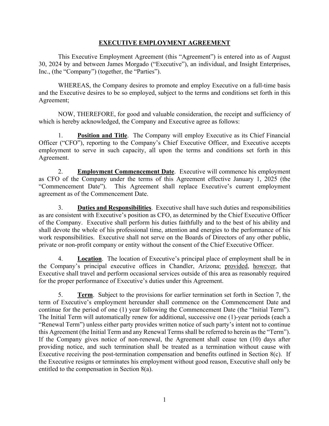 1 EXECUTIVE EMPLOYMENT AGREEMENT This Executive Employment Agreement (this “Agreement”) is entered into as of August 30, 2024 by and between James Morgado (“Executive”), an individual, and Insight Enterprises, Inc., (the “Company”) (together, the “Parties”). WHEREAS, the Company desires to promote and employ Executive on a full-time basis and the Executive desires to be so employed, subject to the terms and conditions set forth in this Agreement; NOW, THEREFORE, for good and valuable consideration, the receipt and sufficiency of which is hereby acknowledged, the Company and Executive agree as follows: 1. Position and Title. The Company will employ Executive as its Chief Financial Officer (“CFO”), reporting to the Company’s Chief Executive Officer, and Executive accepts employment to serve in such capacity, all upon the terms and conditions set forth in this Agreement. 2. Employment Commencement Date. Executive will commence his employment as CFO of the Company under the terms of this Agreement effective January 1, 2025 (the “Commencement Date”). This Agreement shall replace Executive’s current employment agreement as of the Commencement Date. 3. Duties and Responsibilities. Executive shall have such duties and responsibilities as are consistent with Executive’s position as CFO, as determined by the Chief Executive Officer of the Company. Executive shall perform his duties faithfully and to the best of his ability and shall devote the whole of his professional time, attention and energies to the performance of his work responsibilities. Executive shall not serve on the Boards of Directors of any other public, private or non-profit company or entity without the consent of the Chief Executive Officer. 4. Location. The location of Executive’s principal place of employment shall be in the Company’s principal executive offices in Chandler, Arizona; provided, however, that Executive shall travel and perform occasional services outside of this area as reasonably required for the proper performance of Executive’s duties under this Agreement. 5. Term. Subject to the provisions for earlier termination set forth in Section 7, the term of Executive’s employment hereunder shall commence on the Commencement Date and continue for the period of one (1) year following the Commencement Date (the “Initial Term”). The Initial Term will automatically renew for additional, successive one (1)-year periods (each a “Renewal Term”) unless either party provides written notice of such party’s intent not to continue this Agreement (the Initial Term and any Renewal Terms shall be referred to herein as the “Term”). If the Company gives notice of non-renewal, the Agreement shall cease ten (10) days after providing notice, and such termination shall be treated as a termination without cause with Executive receiving the post-termination compensation and benefits outlined in Section 8(c). If the Executive resigns or terminates his employment without good reason, Executive shall only be entitled to the compensation in Section 8(a).
