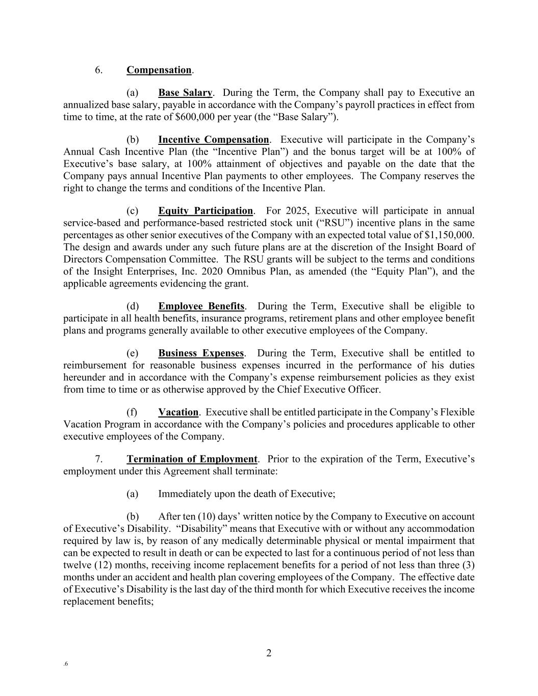 .6 2 6. Compensation. (a) Base Salary. During the Term, the Company shall pay to Executive an annualized base salary, payable in accordance with the Company’s payroll practices in effect from time to time, at the rate of $600,000 per year (the “Base Salary”). (b) Incentive Compensation. Executive will participate in the Company’s Annual Cash Incentive Plan (the “Incentive Plan”) and the bonus target will be at 100% of Executive’s base salary, at 100% attainment of objectives and payable on the date that the Company pays annual Incentive Plan payments to other employees. The Company reserves the right to change the terms and conditions of the Incentive Plan. (c) Equity Participation. For 2025, Executive will participate in annual service-based and performance-based restricted stock unit (“RSU”) incentive plans in the same percentages as other senior executives of the Company with an expected total value of $1,150,000. The design and awards under any such future plans are at the discretion of the Insight Board of Directors Compensation Committee. The RSU grants will be subject to the terms and conditions of the Insight Enterprises, Inc. 2020 Omnibus Plan, as amended (the “Equity Plan”), and the applicable agreements evidencing the grant. (d) Employee Benefits. During the Term, Executive shall be eligible to participate in all health benefits, insurance programs, retirement plans and other employee benefit plans and programs generally available to other executive employees of the Company. (e) Business Expenses. During the Term, Executive shall be entitled to reimbursement for reasonable business expenses incurred in the performance of his duties hereunder and in accordance with the Company’s expense reimbursement policies as they exist from time to time or as otherwise approved by the Chief Executive Officer. (f) Vacation. Executive shall be entitled participate in the Company’s Flexible Vacation Program in accordance with the Company’s policies and procedures applicable to other executive employees of the Company. 7. Termination of Employment. Prior to the expiration of the Term, Executive’s employment under this Agreement shall terminate: (a) Immediately upon the death of Executive; (b) After ten (10) days’ written notice by the Company to Executive on account of Executive’s Disability. “Disability” means that Executive with or without any accommodation required by law is, by reason of any medically determinable physical or mental impairment that can be expected to result in death or can be expected to last for a continuous period of not less than twelve (12) months, receiving income replacement benefits for a period of not less than three (3) months under an accident and health plan covering employees of the Company. The effective date of Executive’s Disability is the last day of the third month for which Executive receives the income replacement benefits;