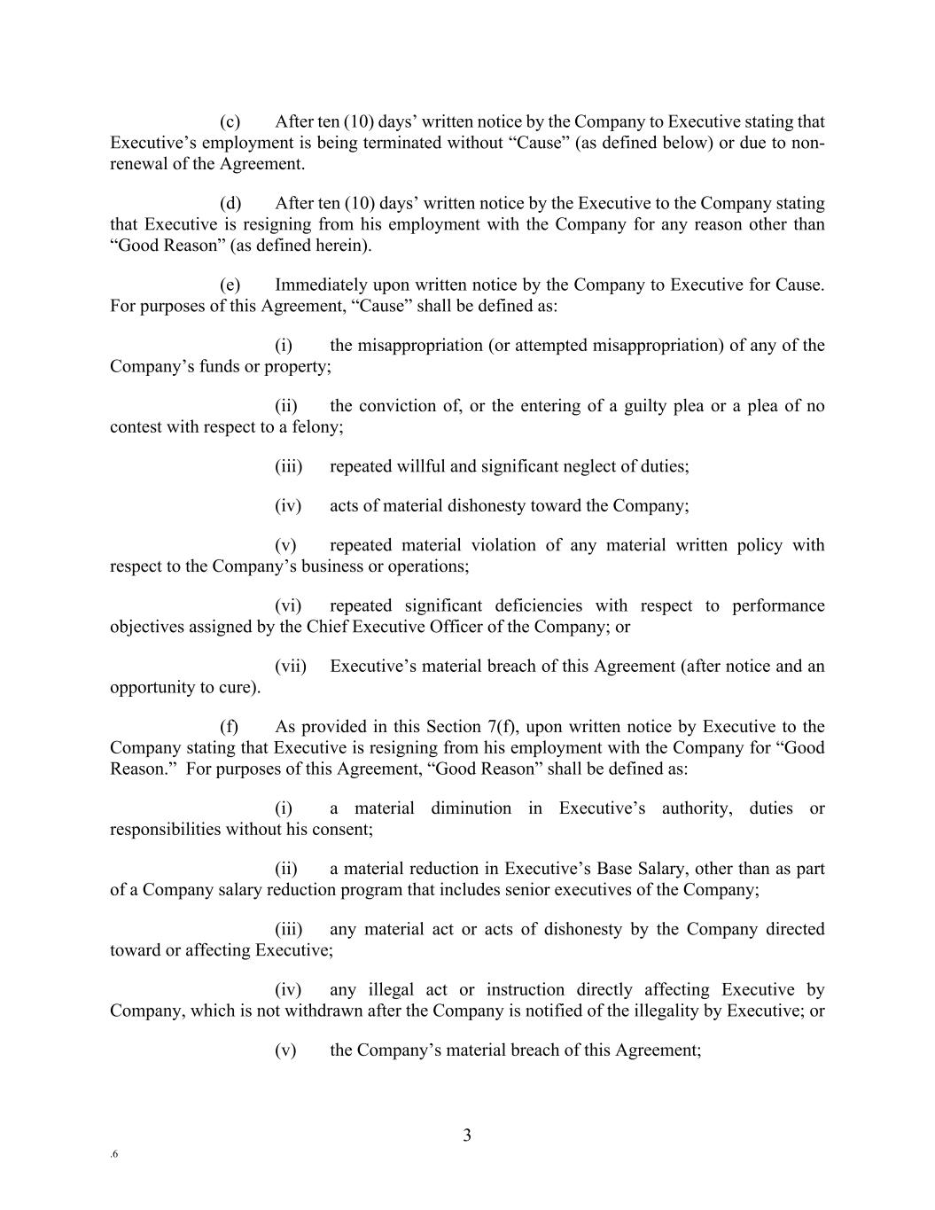 .6 3 (c) After ten (10) days’ written notice by the Company to Executive stating that Executive’s employment is being terminated without “Cause” (as defined below) or due to non- renewal of the Agreement. (d) After ten (10) days’ written notice by the Executive to the Company stating that Executive is resigning from his employment with the Company for any reason other than “Good Reason” (as defined herein). (e) Immediately upon written notice by the Company to Executive for Cause. For purposes of this Agreement, “Cause” shall be defined as: (i) the misappropriation (or attempted misappropriation) of any of the Company’s funds or property; (ii) the conviction of, or the entering of a guilty plea or a plea of no contest with respect to a felony; (iii) repeated willful and significant neglect of duties; (iv) acts of material dishonesty toward the Company; (v) repeated material violation of any material written policy with respect to the Company’s business or operations; (vi) repeated significant deficiencies with respect to performance objectives assigned by the Chief Executive Officer of the Company; or (vii) Executive’s material breach of this Agreement (after notice and an opportunity to cure). (f) As provided in this Section 7(f), upon written notice by Executive to the Company stating that Executive is resigning from his employment with the Company for “Good Reason.” For purposes of this Agreement, “Good Reason” shall be defined as: (i) a material diminution in Executive’s authority, duties or responsibilities without his consent; (ii) a material reduction in Executive’s Base Salary, other than as part of a Company salary reduction program that includes senior executives of the Company; (iii) any material act or acts of dishonesty by the Company directed toward or affecting Executive; (iv) any illegal act or instruction directly affecting Executive by Company, which is not withdrawn after the Company is notified of the illegality by Executive; or (v) the Company’s material breach of this Agreement;