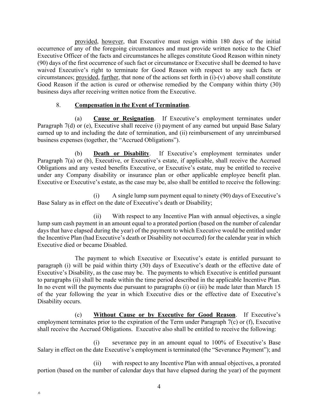.6 4 provided, however, that Executive must resign within 180 days of the initial occurrence of any of the foregoing circumstances and must provide written notice to the Chief Executive Officer of the facts and circumstances he alleges constitute Good Reason within ninety (90) days of the first occurrence of such fact or circumstance or Executive shall be deemed to have waived Executive’s right to terminate for Good Reason with respect to any such facts or circumstances; provided, further, that none of the actions set forth in (i)-(v) above shall constitute Good Reason if the action is cured or otherwise remedied by the Company within thirty (30) business days after receiving written notice from the Executive. 8. Compensation in the Event of Termination. (a) Cause or Resignation. If Executive’s employment terminates under Paragraph 7(d) or (e), Executive shall receive (i) payment of any earned but unpaid Base Salary earned up to and including the date of termination, and (ii) reimbursement of any unreimbursed business expenses (together, the “Accrued Obligations”). (b) Death or Disability. If Executive’s employment terminates under Paragraph 7(a) or (b), Executive, or Executive’s estate, if applicable, shall receive the Accrued Obligations and any vested benefits Executive, or Executive’s estate, may be entitled to receive under any Company disability or insurance plan or other applicable employee benefit plan. Executive or Executive’s estate, as the case may be, also shall be entitled to receive the following: (i) A single lump sum payment equal to ninety (90) days of Executive’s Base Salary as in effect on the date of Executive’s death or Disability; (ii) With respect to any Incentive Plan with annual objectives, a single lump sum cash payment in an amount equal to a prorated portion (based on the number of calendar days that have elapsed during the year) of the payment to which Executive would be entitled under the Incentive Plan (had Executive’s death or Disability not occurred) for the calendar year in which Executive died or became Disabled. The payment to which Executive or Executive’s estate is entitled pursuant to paragraph (i) will be paid within thirty (30) days of Executive’s death or the effective date of Executive’s Disability, as the case may be. The payments to which Executive is entitled pursuant to paragraphs (ii) shall be made within the time period described in the applicable Incentive Plan. In no event will the payments due pursuant to paragraphs (i) or (iii) be made later than March 15 of the year following the year in which Executive dies or the effective date of Executive’s Disability occurs. (c) Without Cause or by Executive for Good Reason. If Executive’s employment terminates prior to the expiration of the Term under Paragraph 7(c) or (f), Executive shall receive the Accrued Obligations. Executive also shall be entitled to receive the following: (i) severance pay in an amount equal to 100% of Executive’s Base Salary in effect on the date Executive’s employment is terminated (the “Severance Payment”); and (ii) with respect to any Incentive Plan with annual objectives, a prorated portion (based on the number of calendar days that have elapsed during the year) of the payment
