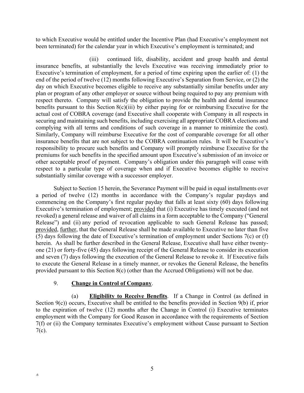 .6 5 to which Executive would be entitled under the Incentive Plan (had Executive’s employment not been terminated) for the calendar year in which Executive’s employment is terminated; and (iii) continued life, disability, accident and group health and dental insurance benefits, at substantially the levels Executive was receiving immediately prior to Executive’s termination of employment, for a period of time expiring upon the earlier of: (1) the end of the period of twelve (12) months following Executive’s Separation from Service, or (2) the day on which Executive becomes eligible to receive any substantially similar benefits under any plan or program of any other employer or source without being required to pay any premium with respect thereto. Company will satisfy the obligation to provide the health and dental insurance benefits pursuant to this Section 8(c)(iii) by either paying for or reimbursing Executive for the actual cost of COBRA coverage (and Executive shall cooperate with Company in all respects in securing and maintaining such benefits, including exercising all appropriate COBRA elections and complying with all terms and conditions of such coverage in a manner to minimize the cost). Similarly, Company will reimburse Executive for the cost of comparable coverage for all other insurance benefits that are not subject to the COBRA continuation rules. It will be Executive’s responsibility to procure such benefits and Company will promptly reimburse Executive for the premiums for such benefits in the specified amount upon Executive’s submission of an invoice or other acceptable proof of payment. Company’s obligation under this paragraph will cease with respect to a particular type of coverage when and if Executive becomes eligible to receive substantially similar coverage with a successor employer. Subject to Section 15 herein, the Severance Payment will be paid in equal installments over a period of twelve (12) months in accordance with the Company’s regular paydays and commencing on the Company’s first regular payday that falls at least sixty (60) days following Executive’s termination of employment; provided that (i) Executive has timely executed (and not revoked) a general release and waiver of all claims in a form acceptable to the Company (“General Release”) and (ii) any period of revocation applicable to such General Release has passed; provided, further, that the General Release shall be made available to Executive no later than five (5) days following the date of Executive’s termination of employment under Sections 7(c) or (f) herein. As shall be further described in the General Release, Executive shall have either twenty- one (21) or forty-five (45) days following receipt of the General Release to consider its execution and seven (7) days following the execution of the General Release to revoke it. If Executive fails to execute the General Release in a timely manner, or revokes the General Release, the benefits provided pursuant to this Section 8(c) (other than the Accrued Obligations) will not be due. 9. Change in Control of Company. (a) Eligibility to Receive Benefits. If a Change in Control (as defined in Section 9(c)) occurs, Executive shall be entitled to the benefits provided in Section 9(b) if, prior to the expiration of twelve (12) months after the Change in Control (i) Executive terminates employment with the Company for Good Reason in accordance with the requirements of Section 7(f) or (ii) the Company terminates Executive’s employment without Cause pursuant to Section 7(c).