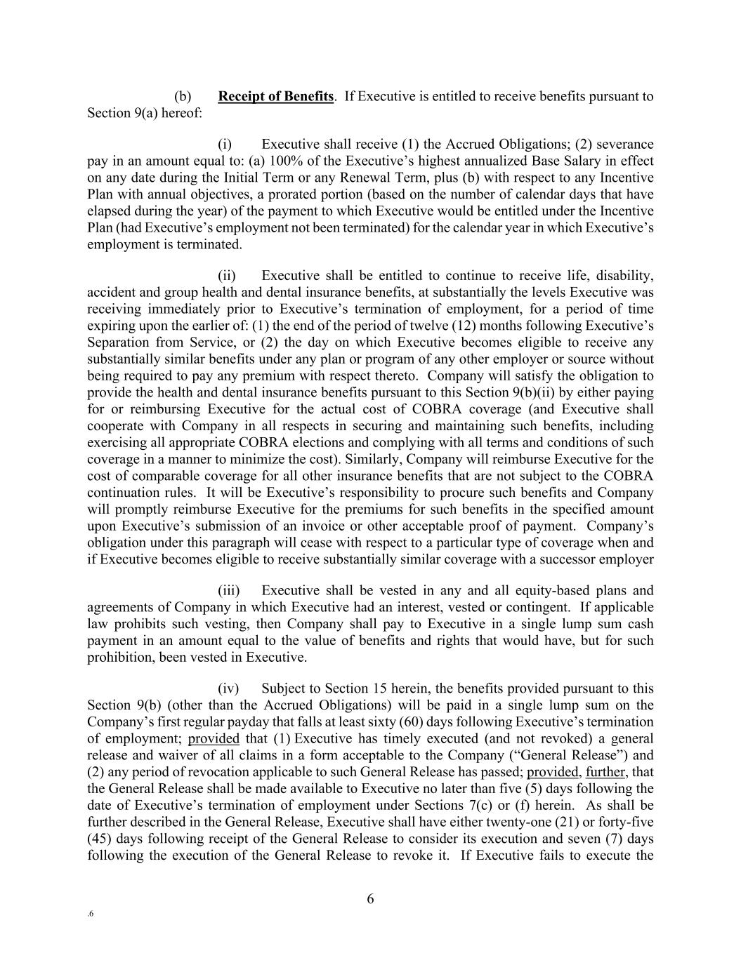 .6 6 (b) Receipt of Benefits. If Executive is entitled to receive benefits pursuant to Section 9(a) hereof: (i) Executive shall receive (1) the Accrued Obligations; (2) severance pay in an amount equal to: (a) 100% of the Executive’s highest annualized Base Salary in effect on any date during the Initial Term or any Renewal Term, plus (b) with respect to any Incentive Plan with annual objectives, a prorated portion (based on the number of calendar days that have elapsed during the year) of the payment to which Executive would be entitled under the Incentive Plan (had Executive’s employment not been terminated) for the calendar year in which Executive’s employment is terminated. (ii) Executive shall be entitled to continue to receive life, disability, accident and group health and dental insurance benefits, at substantially the levels Executive was receiving immediately prior to Executive’s termination of employment, for a period of time expiring upon the earlier of: (1) the end of the period of twelve (12) months following Executive’s Separation from Service, or (2) the day on which Executive becomes eligible to receive any substantially similar benefits under any plan or program of any other employer or source without being required to pay any premium with respect thereto. Company will satisfy the obligation to provide the health and dental insurance benefits pursuant to this Section 9(b)(ii) by either paying for or reimbursing Executive for the actual cost of COBRA coverage (and Executive shall cooperate with Company in all respects in securing and maintaining such benefits, including exercising all appropriate COBRA elections and complying with all terms and conditions of such coverage in a manner to minimize the cost). Similarly, Company will reimburse Executive for the cost of comparable coverage for all other insurance benefits that are not subject to the COBRA continuation rules. It will be Executive’s responsibility to procure such benefits and Company will promptly reimburse Executive for the premiums for such benefits in the specified amount upon Executive’s submission of an invoice or other acceptable proof of payment. Company’s obligation under this paragraph will cease with respect to a particular type of coverage when and if Executive becomes eligible to receive substantially similar coverage with a successor employer (iii) Executive shall be vested in any and all equity-based plans and agreements of Company in which Executive had an interest, vested or contingent. If applicable law prohibits such vesting, then Company shall pay to Executive in a single lump sum cash payment in an amount equal to the value of benefits and rights that would have, but for such prohibition, been vested in Executive. (iv) Subject to Section 15 herein, the benefits provided pursuant to this Section 9(b) (other than the Accrued Obligations) will be paid in a single lump sum on the Company’s first regular payday that falls at least sixty (60) days following Executive’s termination of employment; provided that (1) Executive has timely executed (and not revoked) a general release and waiver of all claims in a form acceptable to the Company (“General Release”) and (2) any period of revocation applicable to such General Release has passed; provided, further, that the General Release shall be made available to Executive no later than five (5) days following the date of Executive’s termination of employment under Sections 7(c) or (f) herein. As shall be further described in the General Release, Executive shall have either twenty-one (21) or forty-five (45) days following receipt of the General Release to consider its execution and seven (7) days following the execution of the General Release to revoke it. If Executive fails to execute the