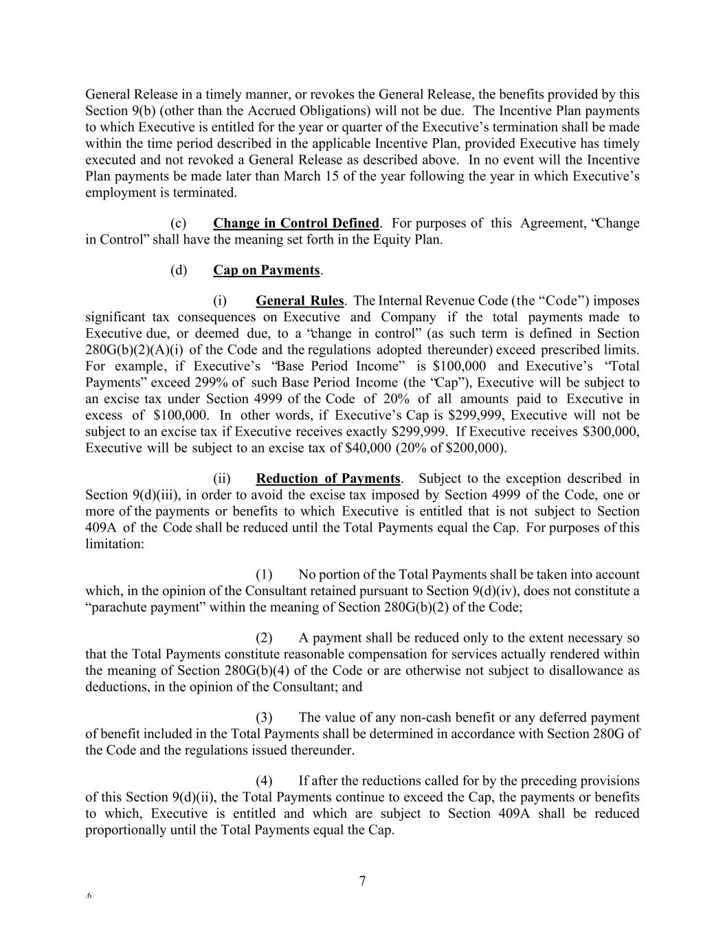 .6 7 General Release in a timely manner, or revokes the General Release, the benefits provided by this Section 9(b) (other than the Accrued Obligations) will not be due. The Incentive Plan payments to which Executive is entitled for the year or quarter of the Executive’s termination shall be made within the time period described in the applicable Incentive Plan, provided Executive has timely executed and not revoked a General Release as described above. In no event will the Incentive Plan payments be made later than March 15 of the year following the year in which Executive’s employment is terminated. (c) Change in Control Defined. For purposes of this Agreement, “Change in Control” shall have the meaning set forth in the Equity Plan. (d) Cap on Payments. (i) General Rules. The Internal Revenue Code (the “Code”) imposes significant tax consequences on Executive and Company if the total payments made to Executive due, or deemed due, to a “change in control” (as such term is defined in Section 280G(b)(2)(A)(i) of the Code and the regulations adopted thereunder) exceed prescribed limits. For example, if Executive’s “Base Period Income” is $100,000 and Executive’s “Total Payments” exceed 299% of such Base Period Income (the “Cap”), Executive will be subject to an excise tax under Section 4999 of the Code of 20% of all amounts paid to Executive in excess of $100,000. In other words, if Executive’s Cap is $299,999, Executive will not be subject to an excise tax if Executive receives exactly $299,999. If Executive receives $300,000, Executive will be subject to an excise tax of $40,000 (20% of $200,000). (ii) Reduction of Payments. Subject to the exception described in Section 9(d)(iii), in order to avoid the excise tax imposed by Section 4999 of the Code, one or more of the payments or benefits to which Executive is entitled that is not subject to Section 409A of the Code shall be reduced until the Total Payments equal the Cap. For purposes of this limitation: (1) No portion of the Total Payments shall be taken into account which, in the opinion of the Consultant retained pursuant to Section 9(d)(iv), does not constitute a “parachute payment” within the meaning of Section 280G(b)(2) of the Code; (2) A payment shall be reduced only to the extent necessary so that the Total Payments constitute reasonable compensation for services actually rendered within the meaning of Section 280G(b)(4) of the Code or are otherwise not subject to disallowance as deductions, in the opinion of the Consultant; and (3) The value of any non-cash benefit or any deferred payment of benefit included in the Total Payments shall be determined in accordance with Section 280G of the Code and the regulations issued thereunder. (4) If after the reductions called for by the preceding provisions of this Section 9(d)(ii), the Total Payments continue to exceed the Cap, the payments or benefits to which, Executive is entitled and which are subject to Section 409A shall be reduced proportionally until the Total Payments equal the Cap.