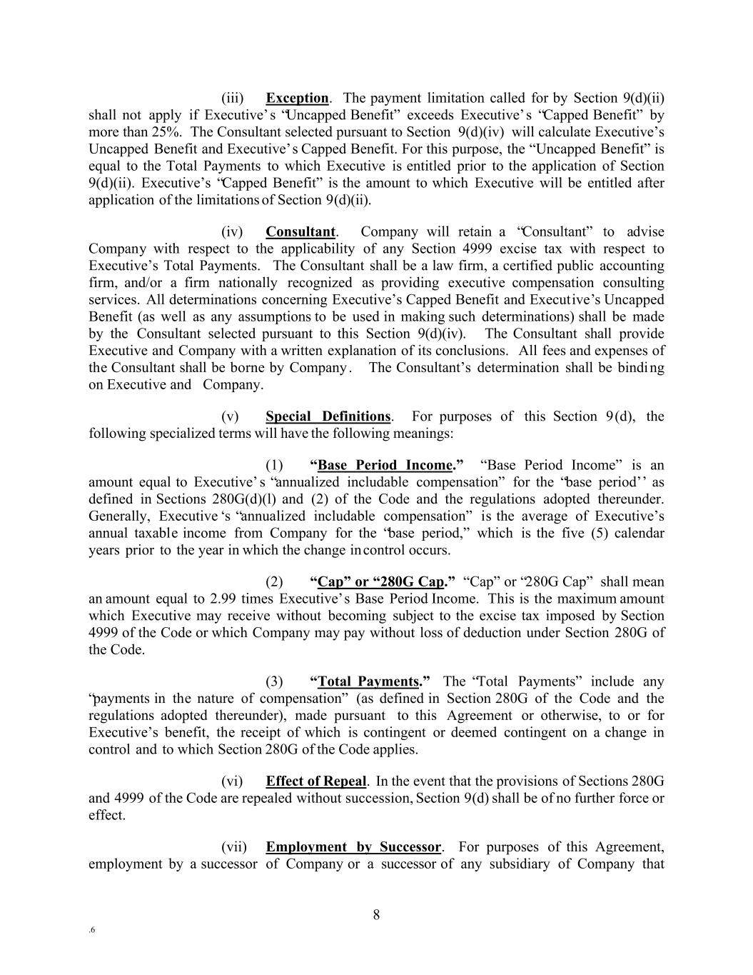.6 8 (iii) Exception. The payment limitation called for by Section 9(d)(ii) shall not apply if Executive’ s “Uncapped Benefit” exceeds Executive’ s “Capped Benefit” by more than 25%. The Consultant selected pursuant to Section 9(d)(iv) will calculate Executive’s Uncapped Benefit and Executive’ s Capped Benefit. For this purpose, the “Uncapped Benefit” is equal to the Total Payments to which Executive is entitled prior to the application of Section 9(d)(ii). Executive’s “Capped Benefit” is the amount to which Executive will be entitled after application of the limitations of Section 9(d)(ii). (iv) Consultant. Company will retain a “Consultant” to advise Company with respect to the applicability of any Section 4999 excise tax with respect to Executive’s Total Payments. The Consultant shall be a law firm, a certified public accounting firm, and/or a firm nationally recognized as providing executive compensation consulting services. All determinations concerning Executive’s Capped Benefit and Executive’s Uncapped Benefit (as well as any assumptions to be used in making such determinations) shall be made by the Consultant selected pursuant to this Section 9(d)(iv). The Consultant shall provide Executive and Company with a written explanation of its conclusions. All fees and expenses of the Consultant shall be borne by Company . The Consultant’s determination shall be binding on Executive and Company. (v) Special Definitions. For purposes of this Section 9(d), the following specialized terms will have the following meanings: (1) “Base Period Income.” “Base Period Income” is an amount equal to Executive’ s “annualized includable compensation” for the “base period’’ as defined in Sections 280G(d)(l) and (2) of the Code and the regulations adopted thereunder. Generally, Executive ‘s “annualized includable compensation” is the average of Executive’s annual taxable income from Company for the “base period,” which is the five (5) calendar years prior to the year in which the change in control occurs. (2) “Cap” or “280G Cap.” “Cap” or “280G Cap” shall mean an amount equal to 2.99 times Executive’ s Base Period Income. This is the maximum amount which Executive may receive without becoming subject to the excise tax imposed by Section 4999 of the Code or which Company may pay without loss of deduction under Section 280G of the Code. (3) “Total Payments.” The “Total Payments” include any “payments in the nature of compensation” (as defined in Section 280G of the Code and the regulations adopted thereunder), made pursuant to this Agreement or otherwise, to or for Executive’s benefit, the receipt of which is contingent or deemed contingent on a change in control and to which Section 280G of the Code applies. (vi) Effect of Repeal. In the event that the provisions of Sections 280G and 4999 of the Code are repealed without succession, Section 9(d) shall be of no further force or effect. (vii) Employment by Successor. For purposes of this Agreement, employment by a successor of Company or a successor of any subsidiary of Company that