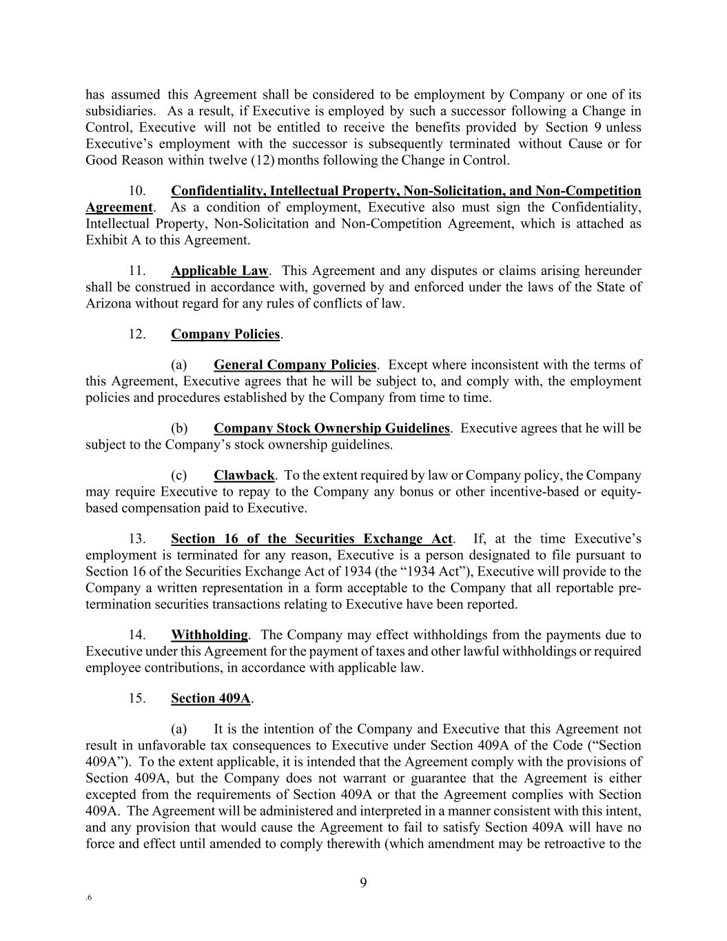 .6 9 has assumed this Agreement shall be considered to be employment by Company or one of its subsidiaries. As a result, if Executive is employed by such a successor following a Change in Control, Executive will not be entitled to receive the benefits provided by Section 9 unless Executive’s employment with the successor is subsequently terminated without Cause or for Good Reason within twelve (12) months following the Change in Control. 10. Confidentiality, Intellectual Property, Non-Solicitation, and Non-Competition Agreement. As a condition of employment, Executive also must sign the Confidentiality, Intellectual Property, Non-Solicitation and Non-Competition Agreement, which is attached as Exhibit A to this Agreement. 11. Applicable Law. This Agreement and any disputes or claims arising hereunder shall be construed in accordance with, governed by and enforced under the laws of the State of Arizona without regard for any rules of conflicts of law. 12. Company Policies. (a) General Company Policies. Except where inconsistent with the terms of this Agreement, Executive agrees that he will be subject to, and comply with, the employment policies and procedures established by the Company from time to time. (b) Company Stock Ownership Guidelines. Executive agrees that he will be subject to the Company’s stock ownership guidelines. (c) Clawback. To the extent required by law or Company policy, the Company may require Executive to repay to the Company any bonus or other incentive-based or equity- based compensation paid to Executive. 13. Section 16 of the Securities Exchange Act. If, at the time Executive’s employment is terminated for any reason, Executive is a person designated to file pursuant to Section 16 of the Securities Exchange Act of 1934 (the “1934 Act”), Executive will provide to the Company a written representation in a form acceptable to the Company that all reportable pre- termination securities transactions relating to Executive have been reported. 14. Withholding. The Company may effect withholdings from the payments due to Executive under this Agreement for the payment of taxes and other lawful withholdings or required employee contributions, in accordance with applicable law. 15. Section 409A. (a) It is the intention of the Company and Executive that this Agreement not result in unfavorable tax consequences to Executive under Section 409A of the Code (“Section 409A”). To the extent applicable, it is intended that the Agreement comply with the provisions of Section 409A, but the Company does not warrant or guarantee that the Agreement is either excepted from the requirements of Section 409A or that the Agreement complies with Section 409A. The Agreement will be administered and interpreted in a manner consistent with this intent, and any provision that would cause the Agreement to fail to satisfy Section 409A will have no force and effect until amended to comply therewith (which amendment may be retroactive to the