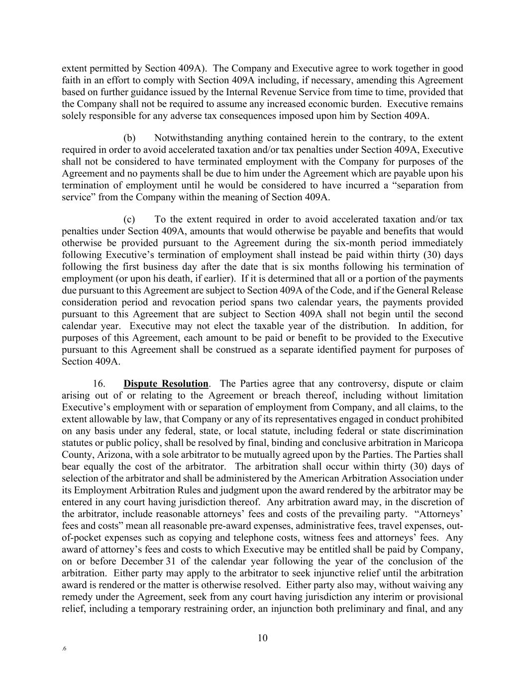 .6 10 extent permitted by Section 409A). The Company and Executive agree to work together in good faith in an effort to comply with Section 409A including, if necessary, amending this Agreement based on further guidance issued by the Internal Revenue Service from time to time, provided that the Company shall not be required to assume any increased economic burden. Executive remains solely responsible for any adverse tax consequences imposed upon him by Section 409A. (b) Notwithstanding anything contained herein to the contrary, to the extent required in order to avoid accelerated taxation and/or tax penalties under Section 409A, Executive shall not be considered to have terminated employment with the Company for purposes of the Agreement and no payments shall be due to him under the Agreement which are payable upon his termination of employment until he would be considered to have incurred a “separation from service” from the Company within the meaning of Section 409A. (c) To the extent required in order to avoid accelerated taxation and/or tax penalties under Section 409A, amounts that would otherwise be payable and benefits that would otherwise be provided pursuant to the Agreement during the six-month period immediately following Executive’s termination of employment shall instead be paid within thirty (30) days following the first business day after the date that is six months following his termination of employment (or upon his death, if earlier). If it is determined that all or a portion of the payments due pursuant to this Agreement are subject to Section 409A of the Code, and if the General Release consideration period and revocation period spans two calendar years, the payments provided pursuant to this Agreement that are subject to Section 409A shall not begin until the second calendar year. Executive may not elect the taxable year of the distribution. In addition, for purposes of this Agreement, each amount to be paid or benefit to be provided to the Executive pursuant to this Agreement shall be construed as a separate identified payment for purposes of Section 409A. 16. Dispute Resolution. The Parties agree that any controversy, dispute or claim arising out of or relating to the Agreement or breach thereof, including without limitation Executive’s employment with or separation of employment from Company, and all claims, to the extent allowable by law, that Company or any of its representatives engaged in conduct prohibited on any basis under any federal, state, or local statute, including federal or state discrimination statutes or public policy, shall be resolved by final, binding and conclusive arbitration in Maricopa County, Arizona, with a sole arbitrator to be mutually agreed upon by the Parties. The Parties shall bear equally the cost of the arbitrator. The arbitration shall occur within thirty (30) days of selection of the arbitrator and shall be administered by the American Arbitration Association under its Employment Arbitration Rules and judgment upon the award rendered by the arbitrator may be entered in any court having jurisdiction thereof. Any arbitration award may, in the discretion of the arbitrator, include reasonable attorneys’ fees and costs of the prevailing party. “Attorneys’ fees and costs” mean all reasonable pre-award expenses, administrative fees, travel expenses, out- of-pocket expenses such as copying and telephone costs, witness fees and attorneys’ fees. Any award of attorney’s fees and costs to which Executive may be entitled shall be paid by Company, on or before December 31 of the calendar year following the year of the conclusion of the arbitration. Either party may apply to the arbitrator to seek injunctive relief until the arbitration award is rendered or the matter is otherwise resolved. Either party also may, without waiving any remedy under the Agreement, seek from any court having jurisdiction any interim or provisional relief, including a temporary restraining order, an injunction both preliminary and final, and any