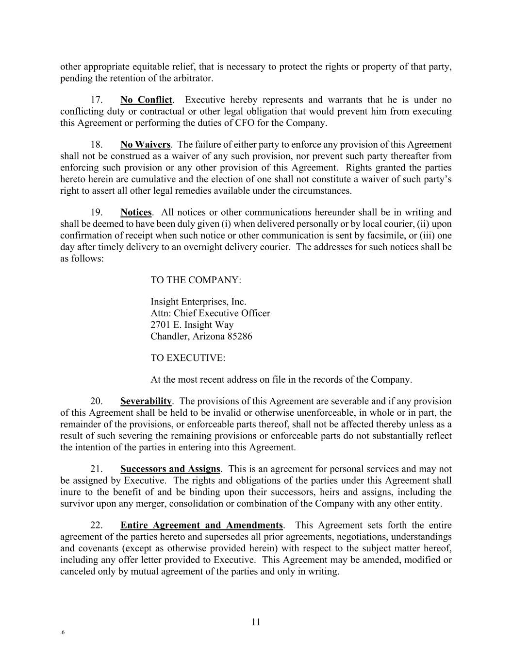 .6 11 other appropriate equitable relief, that is necessary to protect the rights or property of that party, pending the retention of the arbitrator. 17. No Conflict. Executive hereby represents and warrants that he is under no conflicting duty or contractual or other legal obligation that would prevent him from executing this Agreement or performing the duties of CFO for the Company. 18. No Waivers. The failure of either party to enforce any provision of this Agreement shall not be construed as a waiver of any such provision, nor prevent such party thereafter from enforcing such provision or any other provision of this Agreement. Rights granted the parties hereto herein are cumulative and the election of one shall not constitute a waiver of such party’s right to assert all other legal remedies available under the circumstances. 19. Notices. All notices or other communications hereunder shall be in writing and shall be deemed to have been duly given (i) when delivered personally or by local courier, (ii) upon confirmation of receipt when such notice or other communication is sent by facsimile, or (iii) one day after timely delivery to an overnight delivery courier. The addresses for such notices shall be as follows: TO THE COMPANY: Insight Enterprises, Inc. Attn: Chief Executive Officer 2701 E. Insight Way Chandler, Arizona 85286 TO EXECUTIVE: At the most recent address on file in the records of the Company. 20. Severability. The provisions of this Agreement are severable and if any provision of this Agreement shall be held to be invalid or otherwise unenforceable, in whole or in part, the remainder of the provisions, or enforceable parts thereof, shall not be affected thereby unless as a result of such severing the remaining provisions or enforceable parts do not substantially reflect the intention of the parties in entering into this Agreement. 21. Successors and Assigns. This is an agreement for personal services and may not be assigned by Executive. The rights and obligations of the parties under this Agreement shall inure to the benefit of and be binding upon their successors, heirs and assigns, including the survivor upon any merger, consolidation or combination of the Company with any other entity. 22. Entire Agreement and Amendments. This Agreement sets forth the entire agreement of the parties hereto and supersedes all prior agreements, negotiations, understandings and covenants (except as otherwise provided herein) with respect to the subject matter hereof, including any offer letter provided to Executive. This Agreement may be amended, modified or canceled only by mutual agreement of the parties and only in writing.