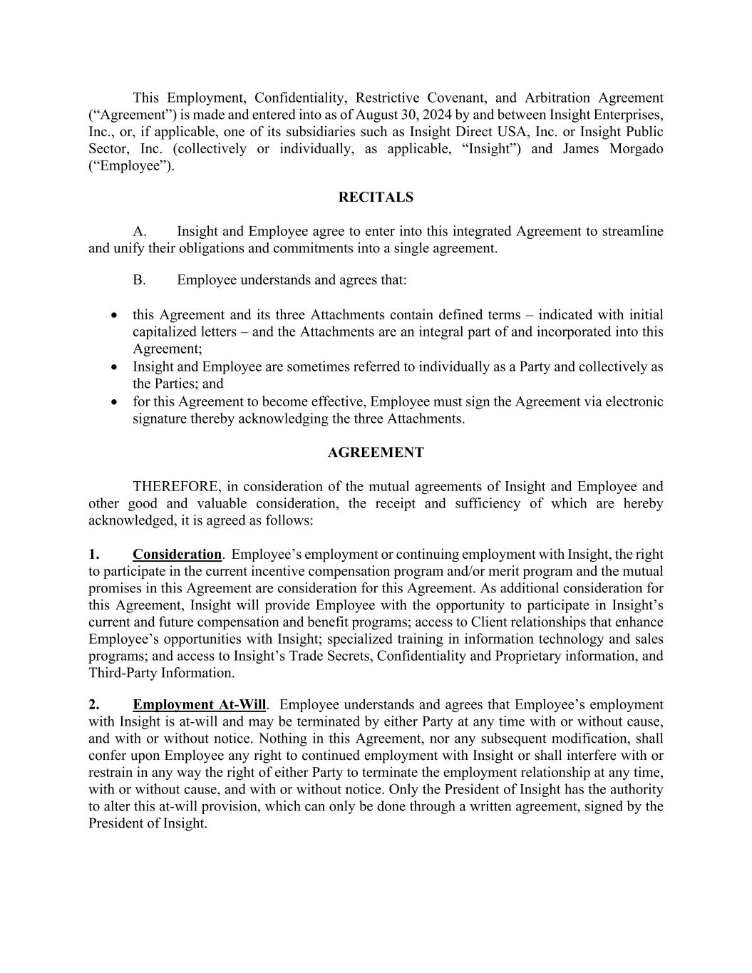 This Employment, Confidentiality, Restrictive Covenant, and Arbitration Agreement (“Agreement”) is made and entered into as of August 30, 2024 by and between Insight Enterprises, Inc., or, if applicable, one of its subsidiaries such as Insight Direct USA, Inc. or Insight Public Sector, Inc. (collectively or individually, as applicable, “Insight”) and James Morgado (“Employee”). RECITALS A. Insight and Employee agree to enter into this integrated Agreement to streamline and unify their obligations and commitments into a single agreement. B. Employee understands and agrees that: • this Agreement and its three Attachments contain defined terms – indicated with initial capitalized letters – and the Attachments are an integral part of and incorporated into this Agreement; • Insight and Employee are sometimes referred to individually as a Party and collectively as the Parties; and • for this Agreement to become effective, Employee must sign the Agreement via electronic signature thereby acknowledging the three Attachments. AGREEMENT THEREFORE, in consideration of the mutual agreements of Insight and Employee and other good and valuable consideration, the receipt and sufficiency of which are hereby acknowledged, it is agreed as follows: 1. Consideration. Employee’s employment or continuing employment with Insight, the right to participate in the current incentive compensation program and/or merit program and the mutual promises in this Agreement are consideration for this Agreement. As additional consideration for this Agreement, Insight will provide Employee with the opportunity to participate in Insight’s current and future compensation and benefit programs; access to Client relationships that enhance Employee’s opportunities with Insight; specialized training in information technology and sales programs; and access to Insight’s Trade Secrets, Confidentiality and Proprietary information, and Third-Party Information. 2. Employment At-Will. Employee understands and agrees that Employee’s employment with Insight is at-will and may be terminated by either Party at any time with or without cause, and with or without notice. Nothing in this Agreement, nor any subsequent modification, shall confer upon Employee any right to continued employment with Insight or shall interfere with or restrain in any way the right of either Party to terminate the employment relationship at any time, with or without cause, and with or without notice. Only the President of Insight has the authority to alter this at-will provision, which can only be done through a written agreement, signed by the President of Insight.