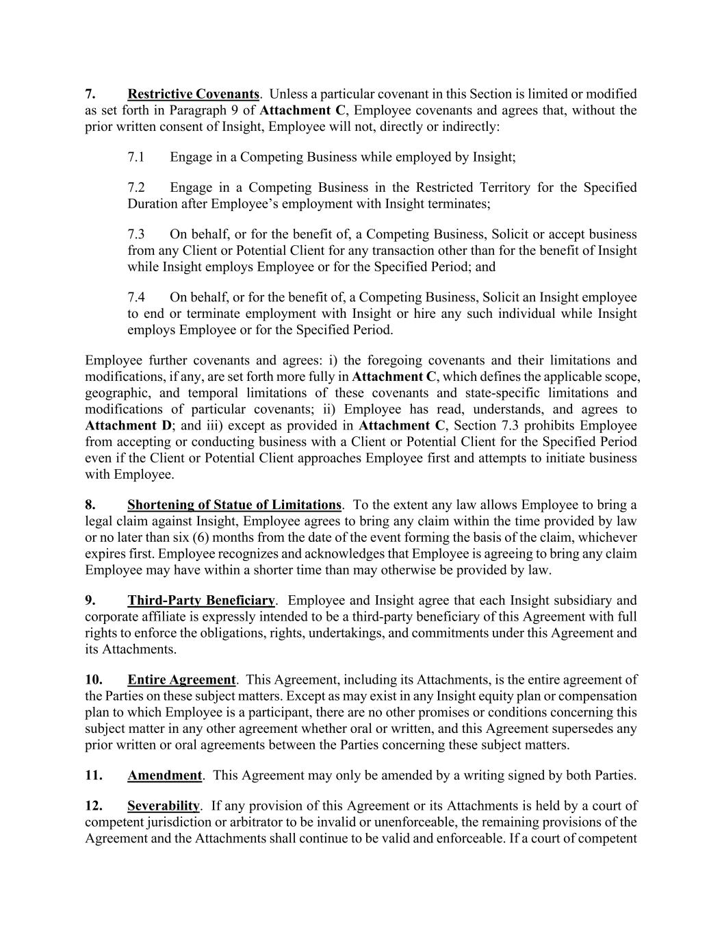 7. Restrictive Covenants. Unless a particular covenant in this Section is limited or modified as set forth in Paragraph 9 of Attachment C, Employee covenants and agrees that, without the prior written consent of Insight, Employee will not, directly or indirectly: 7.1 Engage in a Competing Business while employed by Insight; 7.2 Engage in a Competing Business in the Restricted Territory for the Specified Duration after Employee’s employment with Insight terminates; 7.3 On behalf, or for the benefit of, a Competing Business, Solicit or accept business from any Client or Potential Client for any transaction other than for the benefit of Insight while Insight employs Employee or for the Specified Period; and 7.4 On behalf, or for the benefit of, a Competing Business, Solicit an Insight employee to end or terminate employment with Insight or hire any such individual while Insight employs Employee or for the Specified Period. Employee further covenants and agrees: i) the foregoing covenants and their limitations and modifications, if any, are set forth more fully in Attachment C, which defines the applicable scope, geographic, and temporal limitations of these covenants and state-specific limitations and modifications of particular covenants; ii) Employee has read, understands, and agrees to Attachment D; and iii) except as provided in Attachment C, Section 7.3 prohibits Employee from accepting or conducting business with a Client or Potential Client for the Specified Period even if the Client or Potential Client approaches Employee first and attempts to initiate business with Employee. 8. Shortening of Statue of Limitations. To the extent any law allows Employee to bring a legal claim against Insight, Employee agrees to bring any claim within the time provided by law or no later than six (6) months from the date of the event forming the basis of the claim, whichever expires first. Employee recognizes and acknowledges that Employee is agreeing to bring any claim Employee may have within a shorter time than may otherwise be provided by law. 9. Third-Party Beneficiary. Employee and Insight agree that each Insight subsidiary and corporate affiliate is expressly intended to be a third-party beneficiary of this Agreement with full rights to enforce the obligations, rights, undertakings, and commitments under this Agreement and its Attachments. 10. Entire Agreement. This Agreement, including its Attachments, is the entire agreement of the Parties on these subject matters. Except as may exist in any Insight equity plan or compensation plan to which Employee is a participant, there are no other promises or conditions concerning this subject matter in any other agreement whether oral or written, and this Agreement supersedes any prior written or oral agreements between the Parties concerning these subject matters. 11. Amendment. This Agreement may only be amended by a writing signed by both Parties. 12. Severability. If any provision of this Agreement or its Attachments is held by a court of competent jurisdiction or arbitrator to be invalid or unenforceable, the remaining provisions of the Agreement and the Attachments shall continue to be valid and enforceable. If a court of competent