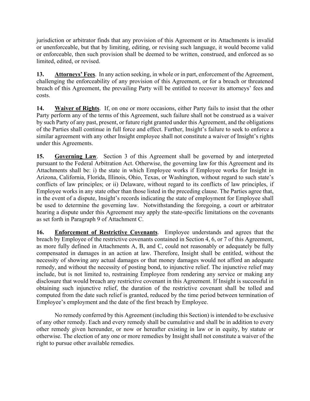jurisdiction or arbitrator finds that any provision of this Agreement or its Attachments is invalid or unenforceable, but that by limiting, editing, or revising such language, it would become valid or enforceable, then such provision shall be deemed to be written, construed, and enforced as so limited, edited, or revised. 13. Attorneys’ Fees. In any action seeking, in whole or in part, enforcement of the Agreement, challenging the enforceability of any provision of this Agreement, or for a breach or threatened breach of this Agreement, the prevailing Party will be entitled to recover its attorneys’ fees and costs. 14. Waiver of Rights. If, on one or more occasions, either Party fails to insist that the other Party perform any of the terms of this Agreement, such failure shall not be construed as a waiver by such Party of any past, present, or future right granted under this Agreement, and the obligations of the Parties shall continue in full force and effect. Further, Insight’s failure to seek to enforce a similar agreement with any other Insight employee shall not constitute a waiver of Insight’s rights under this Agreements. 15. Governing Law. Section 3 of this Agreement shall be governed by and interpreted pursuant to the Federal Arbitration Act. Otherwise, the governing law for this Agreement and its Attachments shall be: i) the state in which Employee works if Employee works for Insight in Arizona, California, Florida, Illinois, Ohio, Texas, or Washington, without regard to such state’s conflicts of law principles; or ii) Delaware, without regard to its conflicts of law principles, if Employee works in any state other than those listed in the preceding clause. The Parties agree that, in the event of a dispute, Insight’s records indicating the state of employment for Employee shall be used to determine the governing law. Notwithstanding the foregoing, a court or arbitrator hearing a dispute under this Agreement may apply the state-specific limitations on the covenants as set forth in Paragraph 9 of Attachment C. 16. Enforcement of Restrictive Covenants. Employee understands and agrees that the breach by Employee of the restrictive covenants contained in Section 4, 6, or 7 of this Agreement, as more fully defined in Attachments A, B, and C, could not reasonably or adequately be fully compensated in damages in an action at law. Therefore, Insight shall be entitled, without the necessity of showing any actual damages or that money damages would not afford an adequate remedy, and without the necessity of posting bond, to injunctive relief. The injunctive relief may include, but is not limited to, restraining Employee from rendering any service or making any disclosure that would breach any restrictive covenant in this Agreement. If Insight is successful in obtaining such injunctive relief, the duration of the restrictive covenant shall be tolled and computed from the date such relief is granted, reduced by the time period between termination of Employee’s employment and the date of the first breach by Employee. No remedy conferred by this Agreement (including this Section) is intended to be exclusive of any other remedy. Each and every remedy shall be cumulative and shall be in addition to every other remedy given hereunder, or now or hereafter existing in law or in equity, by statute or otherwise. The election of any one or more remedies by Insight shall not constitute a waiver of the right to pursue other available remedies.