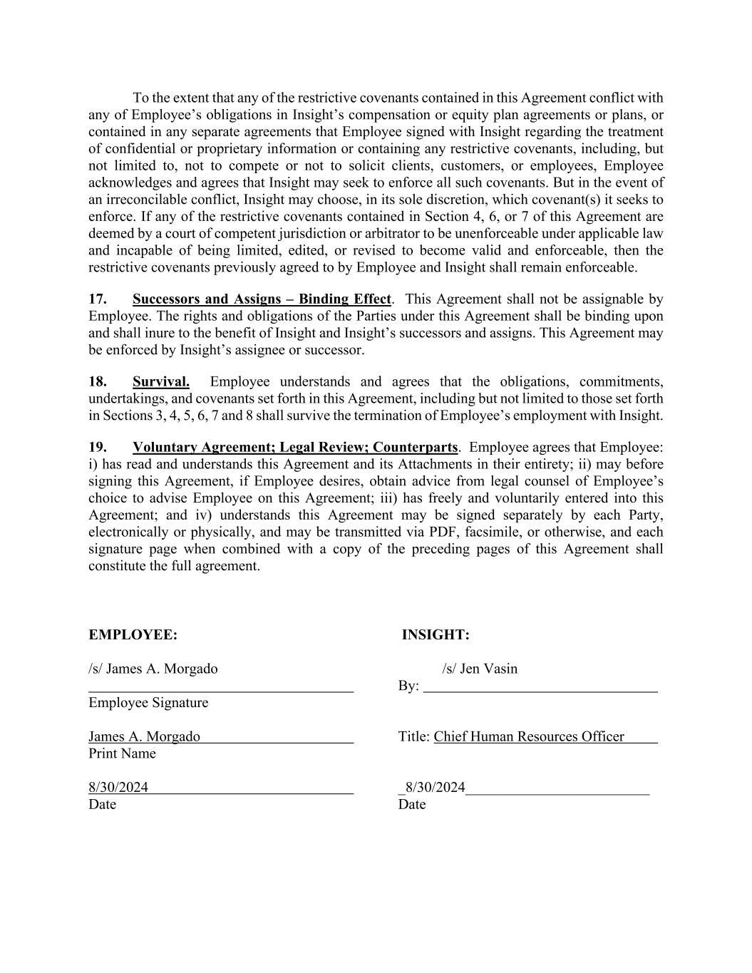 To the extent that any of the restrictive covenants contained in this Agreement conflict with any of Employee’s obligations in Insight’s compensation or equity plan agreements or plans, or contained in any separate agreements that Employee signed with Insight regarding the treatment of confidential or proprietary information or containing any restrictive covenants, including, but not limited to, not to compete or not to solicit clients, customers, or employees, Employee acknowledges and agrees that Insight may seek to enforce all such covenants. But in the event of an irreconcilable conflict, Insight may choose, in its sole discretion, which covenant(s) it seeks to enforce. If any of the restrictive covenants contained in Section 4, 6, or 7 of this Agreement are deemed by a court of competent jurisdiction or arbitrator to be unenforceable under applicable law and incapable of being limited, edited, or revised to become valid and enforceable, then the restrictive covenants previously agreed to by Employee and Insight shall remain enforceable. 17. Successors and Assigns – Binding Effect. This Agreement shall not be assignable by Employee. The rights and obligations of the Parties under this Agreement shall be binding upon and shall inure to the benefit of Insight and Insight’s successors and assigns. This Agreement may be enforced by Insight’s assignee or successor. 18. Survival. Employee understands and agrees that the obligations, commitments, undertakings, and covenants set forth in this Agreement, including but not limited to those set forth in Sections 3, 4, 5, 6, 7 and 8 shall survive the termination of Employee’s employment with Insight. 19. Voluntary Agreement; Legal Review; Counterparts. Employee agrees that Employee: i) has read and understands this Agreement and its Attachments in their entirety; ii) may before signing this Agreement, if Employee desires, obtain advice from legal counsel of Employee’s choice to advise Employee on this Agreement; iii) has freely and voluntarily entered into this Agreement; and iv) understands this Agreement may be signed separately by each Party, electronically or physically, and may be transmitted via PDF, facsimile, or otherwise, and each signature page when combined with a copy of the preceding pages of this Agreement shall constitute the full agreement. EMPLOYEE: INSIGHT: /s/ James A. Morgado /s/ Jen Vasin By: Employee Signature James A. Morgado Title: Chief Human Resources Officer Print Name 8/30/2024 _8/30/2024_________________________ Date Date
