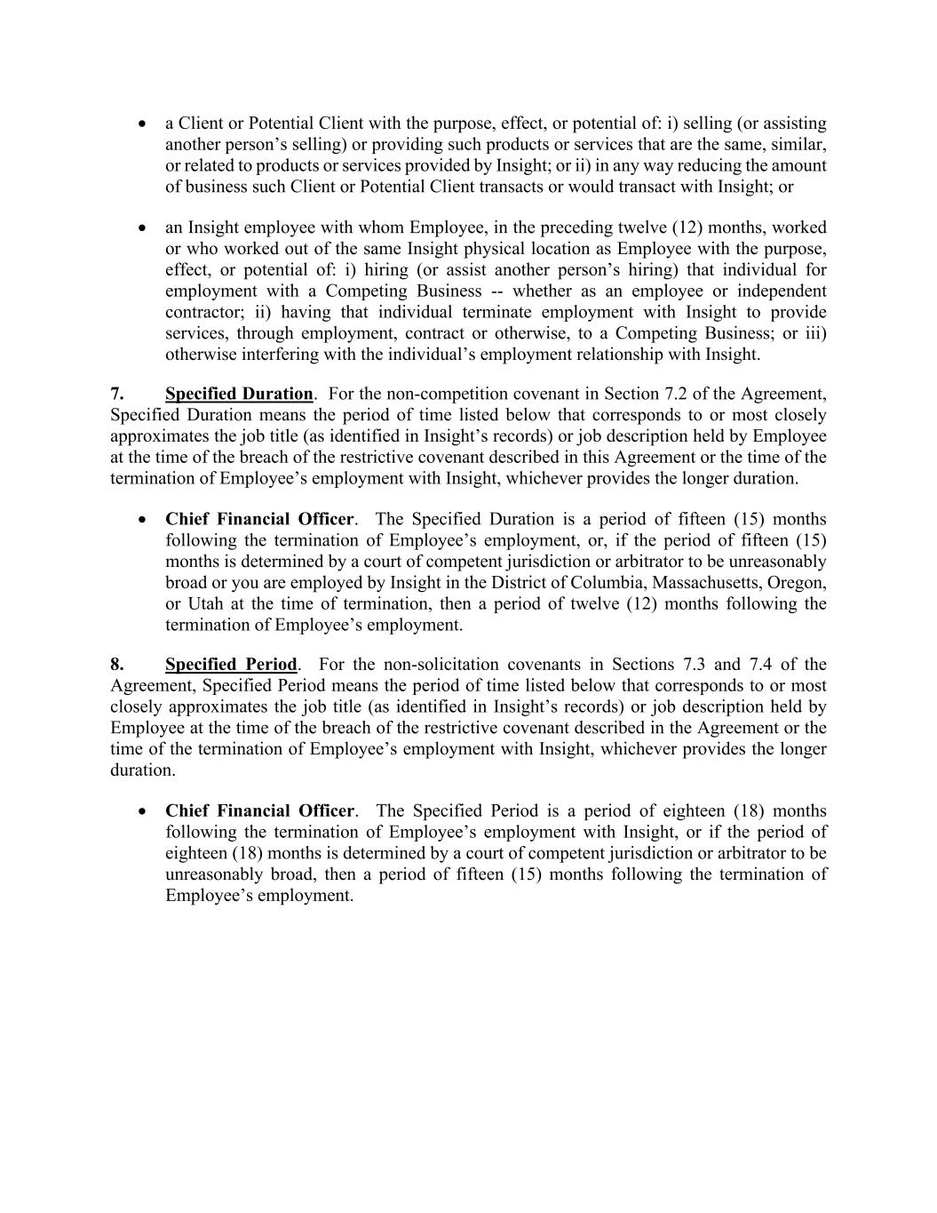 • a Client or Potential Client with the purpose, effect, or potential of: i) selling (or assisting another person’s selling) or providing such products or services that are the same, similar, or related to products or services provided by Insight; or ii) in any way reducing the amount of business such Client or Potential Client transacts or would transact with Insight; or • an Insight employee with whom Employee, in the preceding twelve (12) months, worked or who worked out of the same Insight physical location as Employee with the purpose, effect, or potential of: i) hiring (or assist another person’s hiring) that individual for employment with a Competing Business -- whether as an employee or independent contractor; ii) having that individual terminate employment with Insight to provide services, through employment, contract or otherwise, to a Competing Business; or iii) otherwise interfering with the individual’s employment relationship with Insight. 7. Specified Duration. For the non-competition covenant in Section 7.2 of the Agreement, Specified Duration means the period of time listed below that corresponds to or most closely approximates the job title (as identified in Insight’s records) or job description held by Employee at the time of the breach of the restrictive covenant described in this Agreement or the time of the termination of Employee’s employment with Insight, whichever provides the longer duration. • Chief Financial Officer. The Specified Duration is a period of fifteen (15) months following the termination of Employee’s employment, or, if the period of fifteen (15) months is determined by a court of competent jurisdiction or arbitrator to be unreasonably broad or you are employed by Insight in the District of Columbia, Massachusetts, Oregon, or Utah at the time of termination, then a period of twelve (12) months following the termination of Employee’s employment. 8. Specified Period. For the non-solicitation covenants in Sections 7.3 and 7.4 of the Agreement, Specified Period means the period of time listed below that corresponds to or most closely approximates the job title (as identified in Insight’s records) or job description held by Employee at the time of the breach of the restrictive covenant described in the Agreement or the time of the termination of Employee’s employment with Insight, whichever provides the longer duration. • Chief Financial Officer. The Specified Period is a period of eighteen (18) months following the termination of Employee’s employment with Insight, or if the period of eighteen (18) months is determined by a court of competent jurisdiction or arbitrator to be unreasonably broad, then a period of fifteen (15) months following the termination of Employee’s employment.