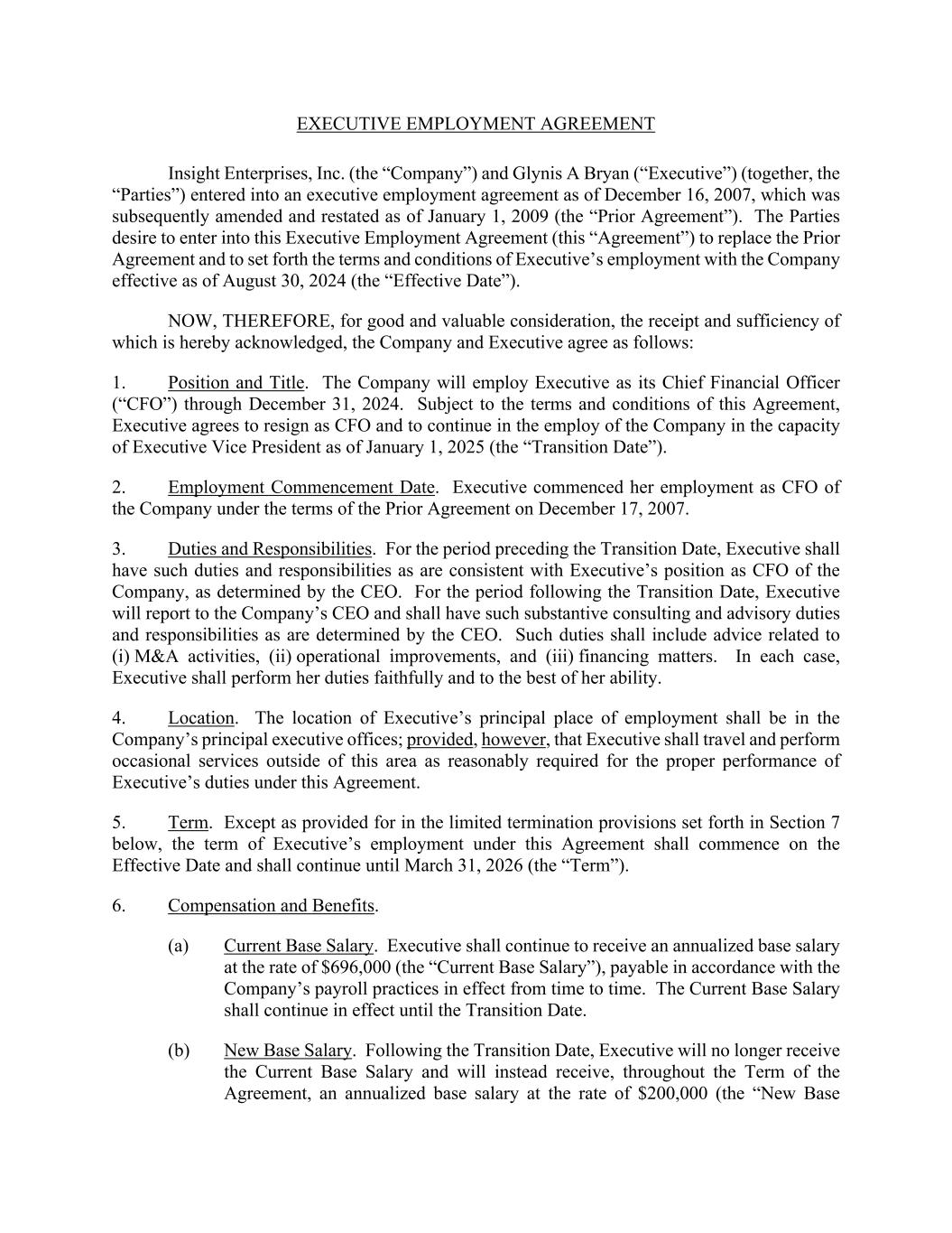 EXECUTIVE EMPLOYMENT AGREEMENT Insight Enterprises, Inc. (the “Company”) and Glynis A Bryan (“Executive”) (together, the “Parties”) entered into an executive employment agreement as of December 16, 2007, which was subsequently amended and restated as of January 1, 2009 (the “Prior Agreement”). The Parties desire to enter into this Executive Employment Agreement (this “Agreement”) to replace the Prior Agreement and to set forth the terms and conditions of Executive’s employment with the Company effective as of August 30, 2024 (the “Effective Date”). NOW, THEREFORE, for good and valuable consideration, the receipt and sufficiency of which is hereby acknowledged, the Company and Executive agree as follows: 1. Position and Title. The Company will employ Executive as its Chief Financial Officer (“CFO”) through December 31, 2024. Subject to the terms and conditions of this Agreement, Executive agrees to resign as CFO and to continue in the employ of the Company in the capacity of Executive Vice President as of January 1, 2025 (the “Transition Date”). 2. Employment Commencement Date. Executive commenced her employment as CFO of the Company under the terms of the Prior Agreement on December 17, 2007. 3. Duties and Responsibilities. For the period preceding the Transition Date, Executive shall have such duties and responsibilities as are consistent with Executive’s position as CFO of the Company, as determined by the CEO. For the period following the Transition Date, Executive will report to the Company’s CEO and shall have such substantive consulting and advisory duties and responsibilities as are determined by the CEO. Such duties shall include advice related to (i) M&A activities, (ii) operational improvements, and (iii) financing matters. In each case, Executive shall perform her duties faithfully and to the best of her ability. 4. Location. The location of Executive’s principal place of employment shall be in the Company’s principal executive offices; provided, however, that Executive shall travel and perform occasional services outside of this area as reasonably required for the proper performance of Executive’s duties under this Agreement. 5. Term. Except as provided for in the limited termination provisions set forth in Section 7 below, the term of Executive’s employment under this Agreement shall commence on the Effective Date and shall continue until March 31, 2026 (the “Term”). 6. Compensation and Benefits. (a) Current Base Salary. Executive shall continue to receive an annualized base salary at the rate of $696,000 (the “Current Base Salary”), payable in accordance with the Company’s payroll practices in effect from time to time. The Current Base Salary shall continue in effect until the Transition Date. (b) New Base Salary. Following the Transition Date, Executive will no longer receive the Current Base Salary and will instead receive, throughout the Term of the Agreement, an annualized base salary at the rate of $200,000 (the “New Base