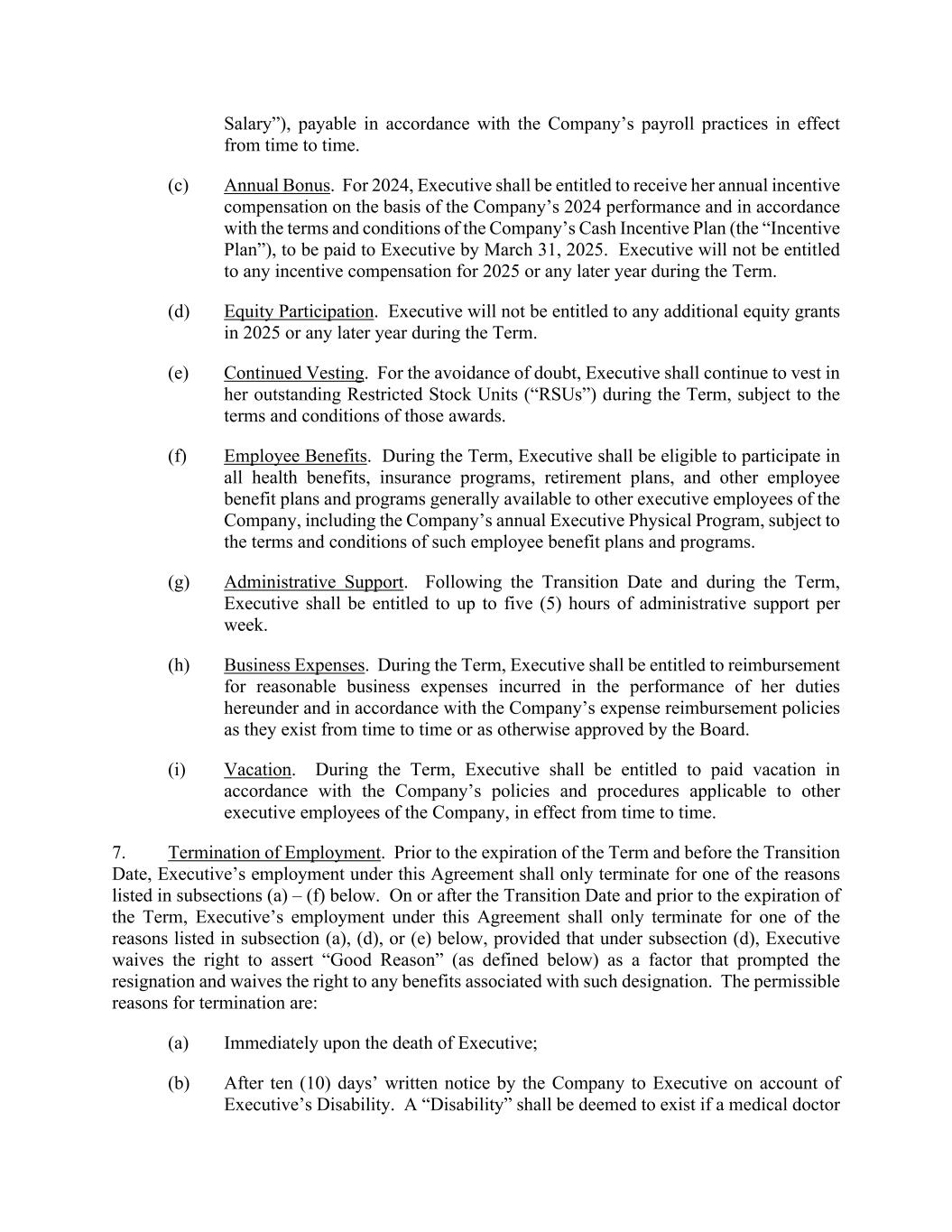 Salary”), payable in accordance with the Company’s payroll practices in effect from time to time. (c) Annual Bonus. For 2024, Executive shall be entitled to receive her annual incentive compensation on the basis of the Company’s 2024 performance and in accordance with the terms and conditions of the Company’s Cash Incentive Plan (the “Incentive Plan”), to be paid to Executive by March 31, 2025. Executive will not be entitled to any incentive compensation for 2025 or any later year during the Term. (d) Equity Participation. Executive will not be entitled to any additional equity grants in 2025 or any later year during the Term. (e) Continued Vesting. For the avoidance of doubt, Executive shall continue to vest in her outstanding Restricted Stock Units (“RSUs”) during the Term, subject to the terms and conditions of those awards. (f) Employee Benefits. During the Term, Executive shall be eligible to participate in all health benefits, insurance programs, retirement plans, and other employee benefit plans and programs generally available to other executive employees of the Company, including the Company’s annual Executive Physical Program, subject to the terms and conditions of such employee benefit plans and programs. (g) Administrative Support. Following the Transition Date and during the Term, Executive shall be entitled to up to five (5) hours of administrative support per week. (h) Business Expenses. During the Term, Executive shall be entitled to reimbursement for reasonable business expenses incurred in the performance of her duties hereunder and in accordance with the Company’s expense reimbursement policies as they exist from time to time or as otherwise approved by the Board. (i) Vacation. During the Term, Executive shall be entitled to paid vacation in accordance with the Company’s policies and procedures applicable to other executive employees of the Company, in effect from time to time. 7. Termination of Employment. Prior to the expiration of the Term and before the Transition Date, Executive’s employment under this Agreement shall only terminate for one of the reasons listed in subsections (a) – (f) below. On or after the Transition Date and prior to the expiration of the Term, Executive’s employment under this Agreement shall only terminate for one of the reasons listed in subsection (a), (d), or (e) below, provided that under subsection (d), Executive waives the right to assert “Good Reason” (as defined below) as a factor that prompted the resignation and waives the right to any benefits associated with such designation. The permissible reasons for termination are: (a) Immediately upon the death of Executive; (b) After ten (10) days’ written notice by the Company to Executive on account of Executive’s Disability. A “Disability” shall be deemed to exist if a medical doctor