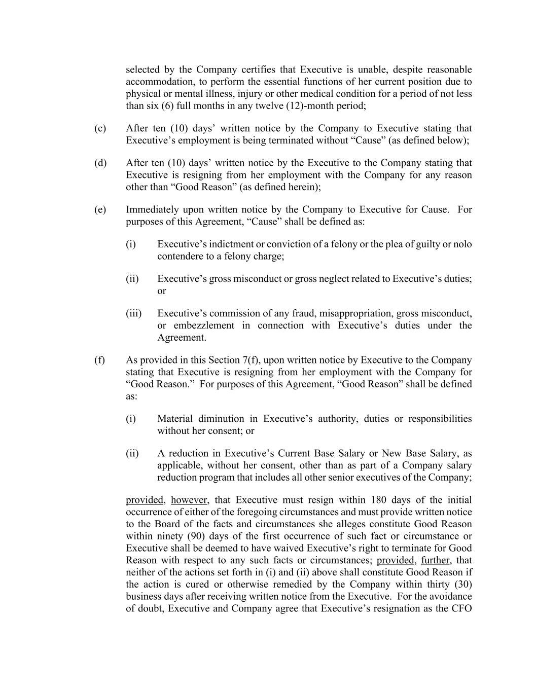 selected by the Company certifies that Executive is unable, despite reasonable accommodation, to perform the essential functions of her current position due to physical or mental illness, injury or other medical condition for a period of not less than six (6) full months in any twelve (12)-month period; (c) After ten (10) days’ written notice by the Company to Executive stating that Executive’s employment is being terminated without “Cause” (as defined below); (d) After ten (10) days’ written notice by the Executive to the Company stating that Executive is resigning from her employment with the Company for any reason other than “Good Reason” (as defined herein); (e) Immediately upon written notice by the Company to Executive for Cause. For purposes of this Agreement, “Cause” shall be defined as: (i) Executive’s indictment or conviction of a felony or the plea of guilty or nolo contendere to a felony charge; (ii) Executive’s gross misconduct or gross neglect related to Executive’s duties; or (iii) Executive’s commission of any fraud, misappropriation, gross misconduct, or embezzlement in connection with Executive’s duties under the Agreement. (f) As provided in this Section 7(f), upon written notice by Executive to the Company stating that Executive is resigning from her employment with the Company for “Good Reason.” For purposes of this Agreement, “Good Reason” shall be defined as: (i) Material diminution in Executive’s authority, duties or responsibilities without her consent; or (ii) A reduction in Executive’s Current Base Salary or New Base Salary, as applicable, without her consent, other than as part of a Company salary reduction program that includes all other senior executives of the Company; provided, however, that Executive must resign within 180 days of the initial occurrence of either of the foregoing circumstances and must provide written notice to the Board of the facts and circumstances she alleges constitute Good Reason within ninety (90) days of the first occurrence of such fact or circumstance or Executive shall be deemed to have waived Executive’s right to terminate for Good Reason with respect to any such facts or circumstances; provided, further, that neither of the actions set forth in (i) and (ii) above shall constitute Good Reason if the action is cured or otherwise remedied by the Company within thirty (30) business days after receiving written notice from the Executive. For the avoidance of doubt, Executive and Company agree that Executive’s resignation as the CFO