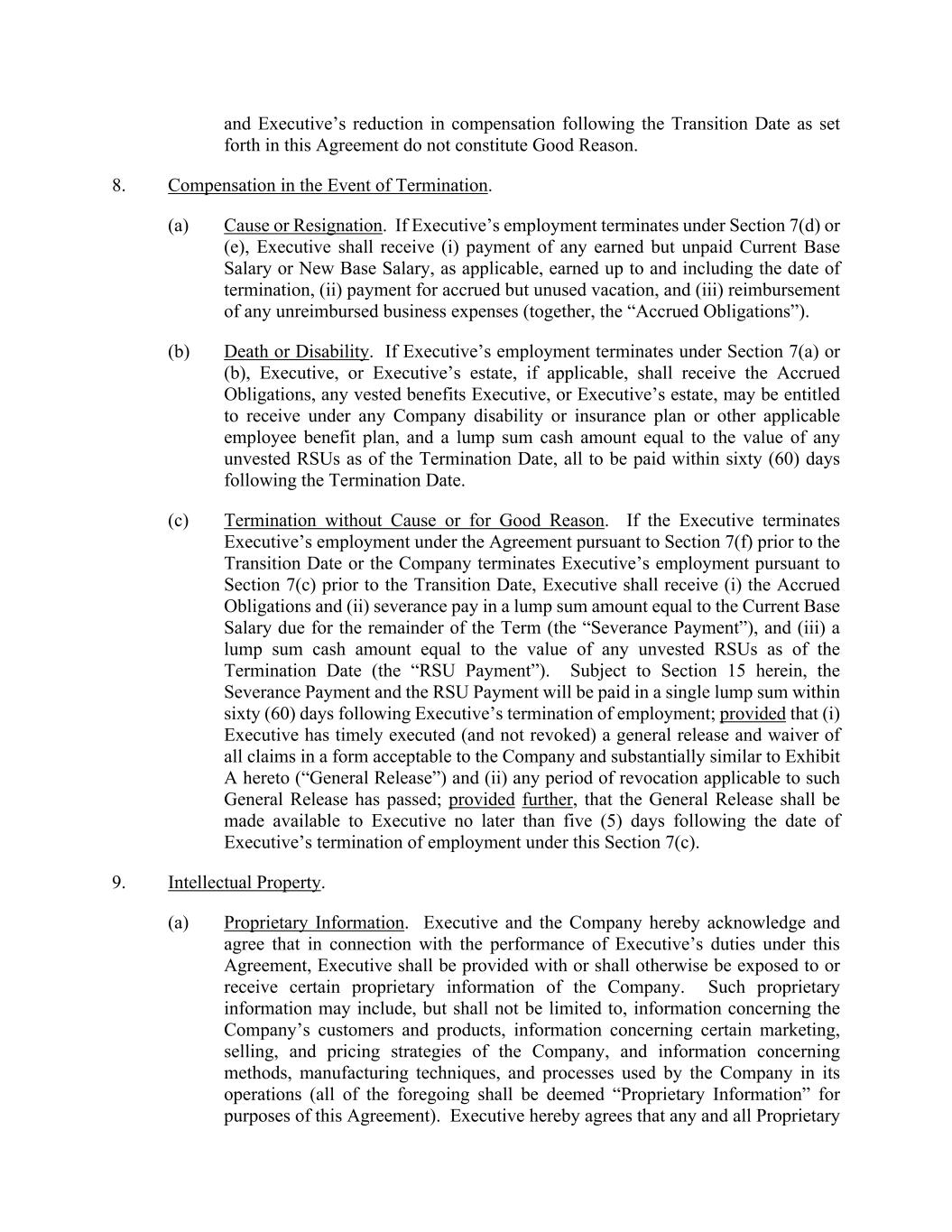 and Executive’s reduction in compensation following the Transition Date as set forth in this Agreement do not constitute Good Reason. 8. Compensation in the Event of Termination. (a) Cause or Resignation. If Executive’s employment terminates under Section 7(d) or (e), Executive shall receive (i) payment of any earned but unpaid Current Base Salary or New Base Salary, as applicable, earned up to and including the date of termination, (ii) payment for accrued but unused vacation, and (iii) reimbursement of any unreimbursed business expenses (together, the “Accrued Obligations”). (b) Death or Disability. If Executive’s employment terminates under Section 7(a) or (b), Executive, or Executive’s estate, if applicable, shall receive the Accrued Obligations, any vested benefits Executive, or Executive’s estate, may be entitled to receive under any Company disability or insurance plan or other applicable employee benefit plan, and a lump sum cash amount equal to the value of any unvested RSUs as of the Termination Date, all to be paid within sixty (60) days following the Termination Date. (c) Termination without Cause or for Good Reason. If the Executive terminates Executive’s employment under the Agreement pursuant to Section 7(f) prior to the Transition Date or the Company terminates Executive’s employment pursuant to Section 7(c) prior to the Transition Date, Executive shall receive (i) the Accrued Obligations and (ii) severance pay in a lump sum amount equal to the Current Base Salary due for the remainder of the Term (the “Severance Payment”), and (iii) a lump sum cash amount equal to the value of any unvested RSUs as of the Termination Date (the “RSU Payment”). Subject to Section 15 herein, the Severance Payment and the RSU Payment will be paid in a single lump sum within sixty (60) days following Executive’s termination of employment; provided that (i) Executive has timely executed (and not revoked) a general release and waiver of all claims in a form acceptable to the Company and substantially similar to Exhibit A hereto (“General Release”) and (ii) any period of revocation applicable to such General Release has passed; provided further, that the General Release shall be made available to Executive no later than five (5) days following the date of Executive’s termination of employment under this Section 7(c). 9. Intellectual Property. (a) Proprietary Information. Executive and the Company hereby acknowledge and agree that in connection with the performance of Executive’s duties under this Agreement, Executive shall be provided with or shall otherwise be exposed to or receive certain proprietary information of the Company. Such proprietary information may include, but shall not be limited to, information concerning the Company’s customers and products, information concerning certain marketing, selling, and pricing strategies of the Company, and information concerning methods, manufacturing techniques, and processes used by the Company in its operations (all of the foregoing shall be deemed “Proprietary Information” for purposes of this Agreement). Executive hereby agrees that any and all Proprietary