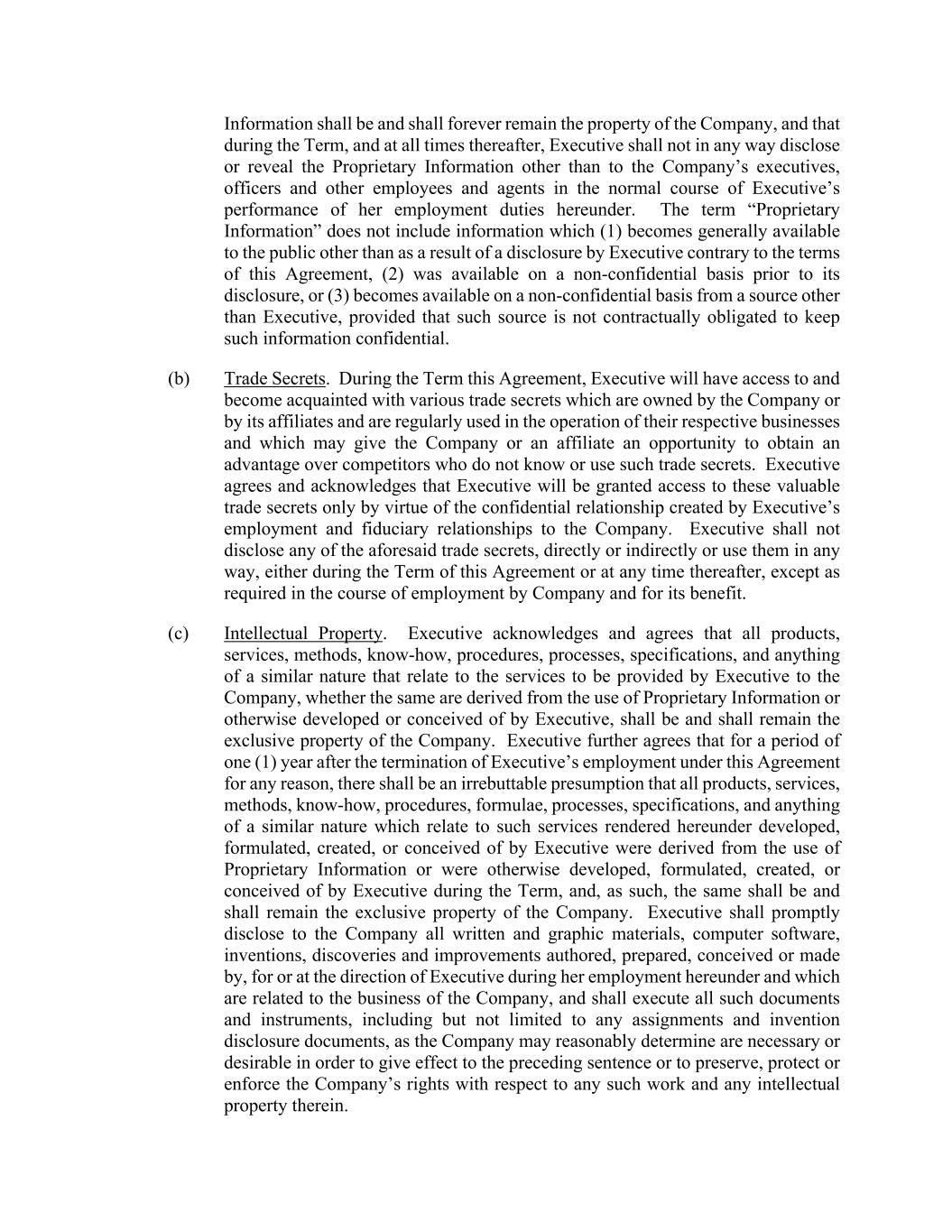 Information shall be and shall forever remain the property of the Company, and that during the Term, and at all times thereafter, Executive shall not in any way disclose or reveal the Proprietary Information other than to the Company’s executives, officers and other employees and agents in the normal course of Executive’s performance of her employment duties hereunder. The term “Proprietary Information” does not include information which (1) becomes generally available to the public other than as a result of a disclosure by Executive contrary to the terms of this Agreement, (2) was available on a non-confidential basis prior to its disclosure, or (3) becomes available on a non-confidential basis from a source other than Executive, provided that such source is not contractually obligated to keep such information confidential. (b) Trade Secrets. During the Term this Agreement, Executive will have access to and become acquainted with various trade secrets which are owned by the Company or by its affiliates and are regularly used in the operation of their respective businesses and which may give the Company or an affiliate an opportunity to obtain an advantage over competitors who do not know or use such trade secrets. Executive agrees and acknowledges that Executive will be granted access to these valuable trade secrets only by virtue of the confidential relationship created by Executive’s employment and fiduciary relationships to the Company. Executive shall not disclose any of the aforesaid trade secrets, directly or indirectly or use them in any way, either during the Term of this Agreement or at any time thereafter, except as required in the course of employment by Company and for its benefit. (c) Intellectual Property. Executive acknowledges and agrees that all products, services, methods, know-how, procedures, processes, specifications, and anything of a similar nature that relate to the services to be provided by Executive to the Company, whether the same are derived from the use of Proprietary Information or otherwise developed or conceived of by Executive, shall be and shall remain the exclusive property of the Company. Executive further agrees that for a period of one (1) year after the termination of Executive’s employment under this Agreement for any reason, there shall be an irrebuttable presumption that all products, services, methods, know-how, procedures, formulae, processes, specifications, and anything of a similar nature which relate to such services rendered hereunder developed, formulated, created, or conceived of by Executive were derived from the use of Proprietary Information or were otherwise developed, formulated, created, or conceived of by Executive during the Term, and, as such, the same shall be and shall remain the exclusive property of the Company. Executive shall promptly disclose to the Company all written and graphic materials, computer software, inventions, discoveries and improvements authored, prepared, conceived or made by, for or at the direction of Executive during her employment hereunder and which are related to the business of the Company, and shall execute all such documents and instruments, including but not limited to any assignments and invention disclosure documents, as the Company may reasonably determine are necessary or desirable in order to give effect to the preceding sentence or to preserve, protect or enforce the Company’s rights with respect to any such work and any intellectual property therein.