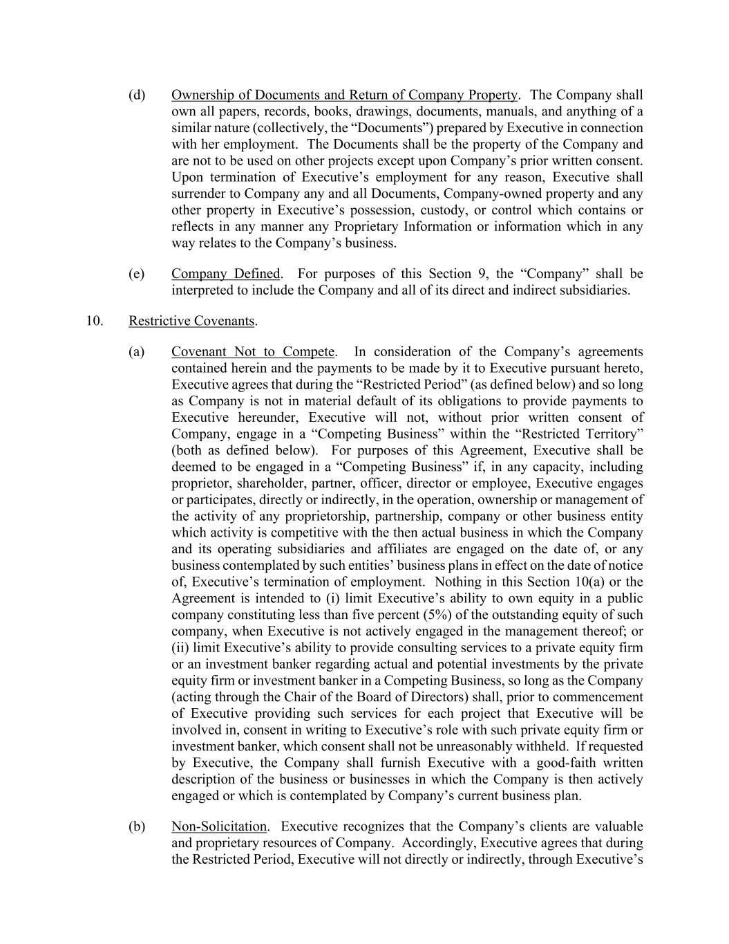 (d) Ownership of Documents and Return of Company Property. The Company shall own all papers, records, books, drawings, documents, manuals, and anything of a similar nature (collectively, the “Documents”) prepared by Executive in connection with her employment. The Documents shall be the property of the Company and are not to be used on other projects except upon Company’s prior written consent. Upon termination of Executive’s employment for any reason, Executive shall surrender to Company any and all Documents, Company-owned property and any other property in Executive’s possession, custody, or control which contains or reflects in any manner any Proprietary Information or information which in any way relates to the Company’s business. (e) Company Defined. For purposes of this Section 9, the “Company” shall be interpreted to include the Company and all of its direct and indirect subsidiaries. 10. Restrictive Covenants. (a) Covenant Not to Compete. In consideration of the Company’s agreements contained herein and the payments to be made by it to Executive pursuant hereto, Executive agrees that during the “Restricted Period” (as defined below) and so long as Company is not in material default of its obligations to provide payments to Executive hereunder, Executive will not, without prior written consent of Company, engage in a “Competing Business” within the “Restricted Territory” (both as defined below). For purposes of this Agreement, Executive shall be deemed to be engaged in a “Competing Business” if, in any capacity, including proprietor, shareholder, partner, officer, director or employee, Executive engages or participates, directly or indirectly, in the operation, ownership or management of the activity of any proprietorship, partnership, company or other business entity which activity is competitive with the then actual business in which the Company and its operating subsidiaries and affiliates are engaged on the date of, or any business contemplated by such entities’ business plans in effect on the date of notice of, Executive’s termination of employment. Nothing in this Section 10(a) or the Agreement is intended to (i) limit Executive’s ability to own equity in a public company constituting less than five percent (5%) of the outstanding equity of such company, when Executive is not actively engaged in the management thereof; or (ii) limit Executive’s ability to provide consulting services to a private equity firm or an investment banker regarding actual and potential investments by the private equity firm or investment banker in a Competing Business, so long as the Company (acting through the Chair of the Board of Directors) shall, prior to commencement of Executive providing such services for each project that Executive will be involved in, consent in writing to Executive’s role with such private equity firm or investment banker, which consent shall not be unreasonably withheld. If requested by Executive, the Company shall furnish Executive with a good-faith written description of the business or businesses in which the Company is then actively engaged or which is contemplated by Company’s current business plan. (b) Non-Solicitation. Executive recognizes that the Company’s clients are valuable and proprietary resources of Company. Accordingly, Executive agrees that during the Restricted Period, Executive will not directly or indirectly, through Executive’s