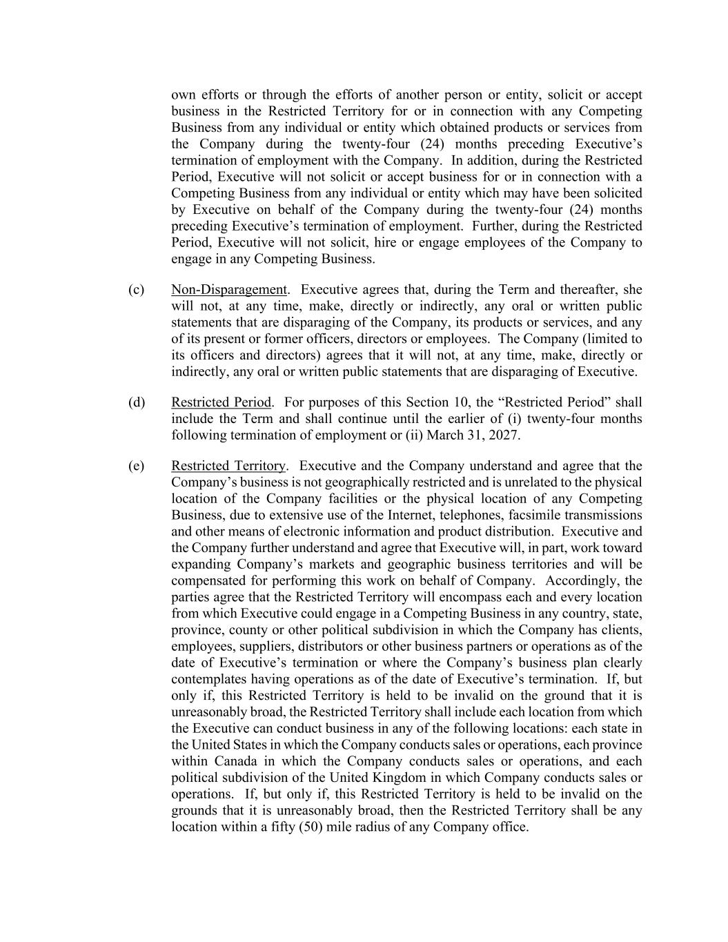 own efforts or through the efforts of another person or entity, solicit or accept business in the Restricted Territory for or in connection with any Competing Business from any individual or entity which obtained products or services from the Company during the twenty-four (24) months preceding Executive’s termination of employment with the Company. In addition, during the Restricted Period, Executive will not solicit or accept business for or in connection with a Competing Business from any individual or entity which may have been solicited by Executive on behalf of the Company during the twenty-four (24) months preceding Executive’s termination of employment. Further, during the Restricted Period, Executive will not solicit, hire or engage employees of the Company to engage in any Competing Business. (c) Non-Disparagement. Executive agrees that, during the Term and thereafter, she will not, at any time, make, directly or indirectly, any oral or written public statements that are disparaging of the Company, its products or services, and any of its present or former officers, directors or employees. The Company (limited to its officers and directors) agrees that it will not, at any time, make, directly or indirectly, any oral or written public statements that are disparaging of Executive. (d) Restricted Period. For purposes of this Section 10, the “Restricted Period” shall include the Term and shall continue until the earlier of (i) twenty-four months following termination of employment or (ii) March 31, 2027. (e) Restricted Territory. Executive and the Company understand and agree that the Company’s business is not geographically restricted and is unrelated to the physical location of the Company facilities or the physical location of any Competing Business, due to extensive use of the Internet, telephones, facsimile transmissions and other means of electronic information and product distribution. Executive and the Company further understand and agree that Executive will, in part, work toward expanding Company’s markets and geographic business territories and will be compensated for performing this work on behalf of Company. Accordingly, the parties agree that the Restricted Territory will encompass each and every location from which Executive could engage in a Competing Business in any country, state, province, county or other political subdivision in which the Company has clients, employees, suppliers, distributors or other business partners or operations as of the date of Executive’s termination or where the Company’s business plan clearly contemplates having operations as of the date of Executive’s termination. If, but only if, this Restricted Territory is held to be invalid on the ground that it is unreasonably broad, the Restricted Territory shall include each location from which the Executive can conduct business in any of the following locations: each state in the United States in which the Company conducts sales or operations, each province within Canada in which the Company conducts sales or operations, and each political subdivision of the United Kingdom in which Company conducts sales or operations. If, but only if, this Restricted Territory is held to be invalid on the grounds that it is unreasonably broad, then the Restricted Territory shall be any location within a fifty (50) mile radius of any Company office.