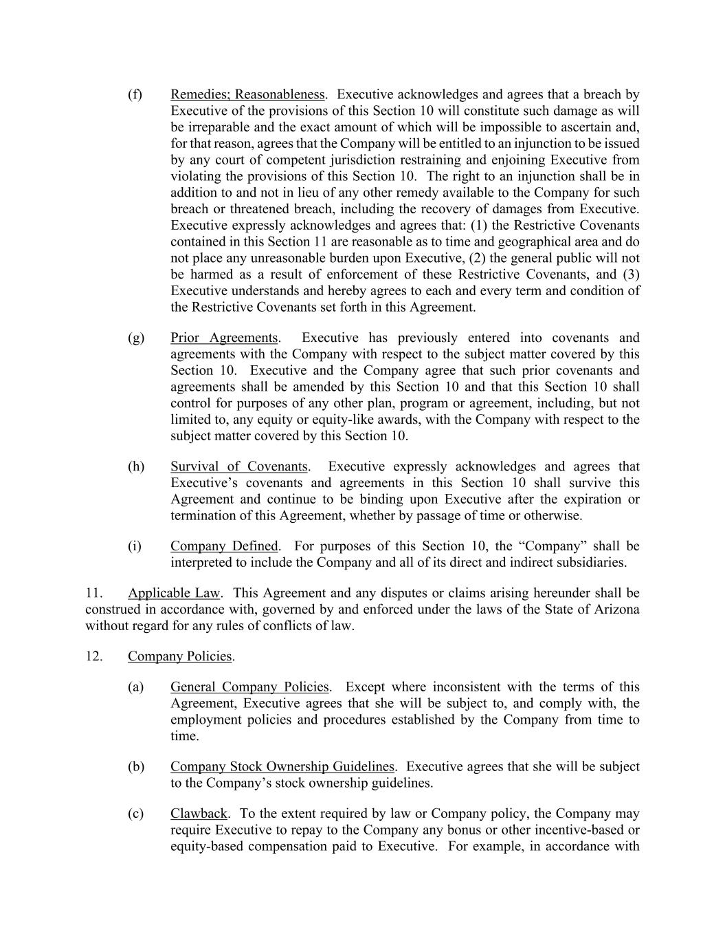 (f) Remedies; Reasonableness. Executive acknowledges and agrees that a breach by Executive of the provisions of this Section 10 will constitute such damage as will be irreparable and the exact amount of which will be impossible to ascertain and, for that reason, agrees that the Company will be entitled to an injunction to be issued by any court of competent jurisdiction restraining and enjoining Executive from violating the provisions of this Section 10. The right to an injunction shall be in addition to and not in lieu of any other remedy available to the Company for such breach or threatened breach, including the recovery of damages from Executive. Executive expressly acknowledges and agrees that: (1) the Restrictive Covenants contained in this Section 11 are reasonable as to time and geographical area and do not place any unreasonable burden upon Executive, (2) the general public will not be harmed as a result of enforcement of these Restrictive Covenants, and (3) Executive understands and hereby agrees to each and every term and condition of the Restrictive Covenants set forth in this Agreement. (g) Prior Agreements. Executive has previously entered into covenants and agreements with the Company with respect to the subject matter covered by this Section 10. Executive and the Company agree that such prior covenants and agreements shall be amended by this Section 10 and that this Section 10 shall control for purposes of any other plan, program or agreement, including, but not limited to, any equity or equity-like awards, with the Company with respect to the subject matter covered by this Section 10. (h) Survival of Covenants. Executive expressly acknowledges and agrees that Executive’s covenants and agreements in this Section 10 shall survive this Agreement and continue to be binding upon Executive after the expiration or termination of this Agreement, whether by passage of time or otherwise. (i) Company Defined. For purposes of this Section 10, the “Company” shall be interpreted to include the Company and all of its direct and indirect subsidiaries. 11. Applicable Law. This Agreement and any disputes or claims arising hereunder shall be construed in accordance with, governed by and enforced under the laws of the State of Arizona without regard for any rules of conflicts of law. 12. Company Policies. (a) General Company Policies. Except where inconsistent with the terms of this Agreement, Executive agrees that she will be subject to, and comply with, the employment policies and procedures established by the Company from time to time. (b) Company Stock Ownership Guidelines. Executive agrees that she will be subject to the Company’s stock ownership guidelines. (c) Clawback. To the extent required by law or Company policy, the Company may require Executive to repay to the Company any bonus or other incentive-based or equity-based compensation paid to Executive. For example, in accordance with
