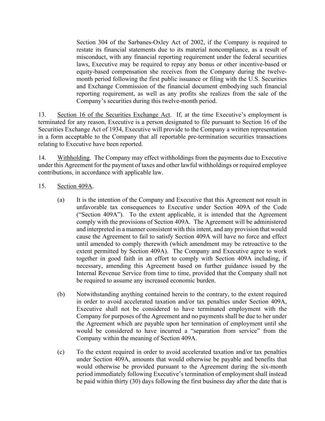 Section 304 of the Sarbanes-Oxley Act of 2002, if the Company is required to restate its financial statements due to its material noncompliance, as a result of misconduct, with any financial reporting requirement under the federal securities laws, Executive may be required to repay any bonus or other incentive-based or equity-based compensation she receives from the Company during the twelve- month period following the first public issuance or filing with the U.S. Securities and Exchange Commission of the financial document embodying such financial reporting requirement, as well as any profits she realizes from the sale of the Company’s securities during this twelve-month period. 13. Section 16 of the Securities Exchange Act. If, at the time Executive’s employment is terminated for any reason, Executive is a person designated to file pursuant to Section 16 of the Securities Exchange Act of 1934, Executive will provide to the Company a written representation in a form acceptable to the Company that all reportable pre-termination securities transactions relating to Executive have been reported. 14. Withholding. The Company may effect withholdings from the payments due to Executive under this Agreement for the payment of taxes and other lawful withholdings or required employee contributions, in accordance with applicable law. 15. Section 409A. (a) It is the intention of the Company and Executive that this Agreement not result in unfavorable tax consequences to Executive under Section 409A of the Code (“Section 409A”). To the extent applicable, it is intended that the Agreement comply with the provisions of Section 409A. The Agreement will be administered and interpreted in a manner consistent with this intent, and any provision that would cause the Agreement to fail to satisfy Section 409A will have no force and effect until amended to comply therewith (which amendment may be retroactive to the extent permitted by Section 409A). The Company and Executive agree to work together in good faith in an effort to comply with Section 409A including, if necessary, amending this Agreement based on further guidance issued by the Internal Revenue Service from time to time, provided that the Company shall not be required to assume any increased economic burden. (b) Notwithstanding anything contained herein to the contrary, to the extent required in order to avoid accelerated taxation and/or tax penalties under Section 409A, Executive shall not be considered to have terminated employment with the Company for purposes of the Agreement and no payments shall be due to her under the Agreement which are payable upon her termination of employment until she would be considered to have incurred a “separation from service” from the Company within the meaning of Section 409A. (c) To the extent required in order to avoid accelerated taxation and/or tax penalties under Section 409A, amounts that would otherwise be payable and benefits that would otherwise be provided pursuant to the Agreement during the six-month period immediately following Executive’s termination of employment shall instead be paid within thirty (30) days following the first business day after the date that is