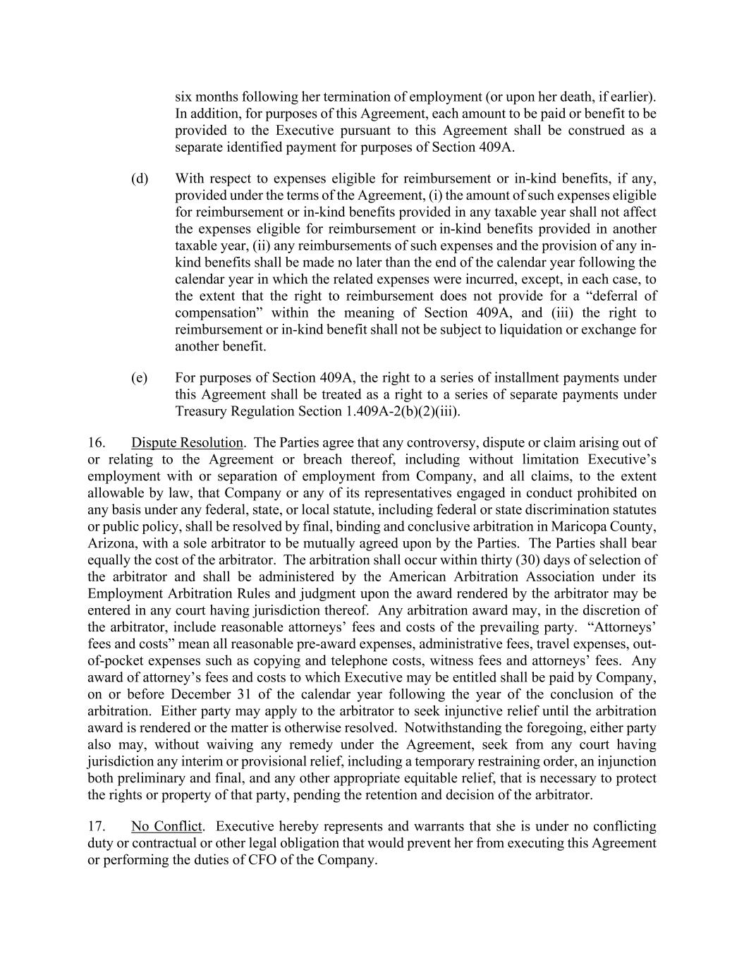 six months following her termination of employment (or upon her death, if earlier). In addition, for purposes of this Agreement, each amount to be paid or benefit to be provided to the Executive pursuant to this Agreement shall be construed as a separate identified payment for purposes of Section 409A. (d) With respect to expenses eligible for reimbursement or in-kind benefits, if any, provided under the terms of the Agreement, (i) the amount of such expenses eligible for reimbursement or in-kind benefits provided in any taxable year shall not affect the expenses eligible for reimbursement or in-kind benefits provided in another taxable year, (ii) any reimbursements of such expenses and the provision of any in- kind benefits shall be made no later than the end of the calendar year following the calendar year in which the related expenses were incurred, except, in each case, to the extent that the right to reimbursement does not provide for a “deferral of compensation” within the meaning of Section 409A, and (iii) the right to reimbursement or in-kind benefit shall not be subject to liquidation or exchange for another benefit. (e) For purposes of Section 409A, the right to a series of installment payments under this Agreement shall be treated as a right to a series of separate payments under Treasury Regulation Section 1.409A-2(b)(2)(iii). 16. Dispute Resolution. The Parties agree that any controversy, dispute or claim arising out of or relating to the Agreement or breach thereof, including without limitation Executive’s employment with or separation of employment from Company, and all claims, to the extent allowable by law, that Company or any of its representatives engaged in conduct prohibited on any basis under any federal, state, or local statute, including federal or state discrimination statutes or public policy, shall be resolved by final, binding and conclusive arbitration in Maricopa County, Arizona, with a sole arbitrator to be mutually agreed upon by the Parties. The Parties shall bear equally the cost of the arbitrator. The arbitration shall occur within thirty (30) days of selection of the arbitrator and shall be administered by the American Arbitration Association under its Employment Arbitration Rules and judgment upon the award rendered by the arbitrator may be entered in any court having jurisdiction thereof. Any arbitration award may, in the discretion of the arbitrator, include reasonable attorneys’ fees and costs of the prevailing party. “Attorneys’ fees and costs” mean all reasonable pre-award expenses, administrative fees, travel expenses, out- of-pocket expenses such as copying and telephone costs, witness fees and attorneys’ fees. Any award of attorney’s fees and costs to which Executive may be entitled shall be paid by Company, on or before December 31 of the calendar year following the year of the conclusion of the arbitration. Either party may apply to the arbitrator to seek injunctive relief until the arbitration award is rendered or the matter is otherwise resolved. Notwithstanding the foregoing, either party also may, without waiving any remedy under the Agreement, seek from any court having jurisdiction any interim or provisional relief, including a temporary restraining order, an injunction both preliminary and final, and any other appropriate equitable relief, that is necessary to protect the rights or property of that party, pending the retention and decision of the arbitrator. 17. No Conflict. Executive hereby represents and warrants that she is under no conflicting duty or contractual or other legal obligation that would prevent her from executing this Agreement or performing the duties of CFO of the Company.