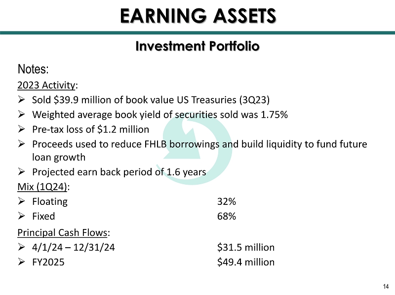 Investment Portfolio Yield 1.98% 1.56% 2.78% 3.59% 3.66% AOCI/(AOCL) 1 $11.3 $3.3 ($32.4) ($28.2) ($27.4) (4 th Quarter for 2020 - 2023, and 1 st Quarter for 2024) Average Life: 6.1 years Effective Duration: 3.9 Composition 3/31/24 $361.9 $564.8 $506.2 EARNING ASSETS Millions $495.1 13 $566.6 1 AOCI is accumulated other comprehensive income and (AOCL) is accumulated other comprehensive loss.