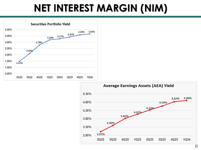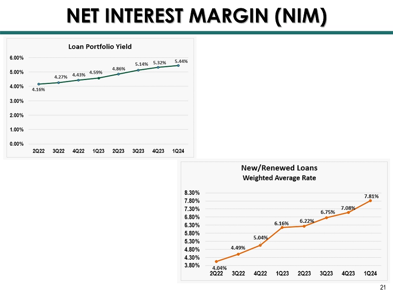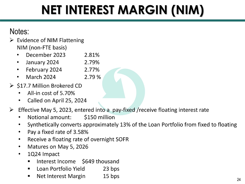 24 Notes: » Evidence of NIM Flattening NIM (non - FTE basis) • December 2023 2.81% • January 2024 2.79% • February 2024 2.77% • March 2024 2.79 % » $17.7 Million Brokered CD • All - in cost of 5.70% • Called on April 25, 2024 » Effective May 5, 2023, entered into a pay - fixed /receive floating interest rate • Notional amount: $150 million • Synthetically converts approximately 13% of the Loan Portfolio from fixed to floating • Pay a fixed rate of 3.58% • Receive a floating rate of overnight SOFR • Matures on May 5, 2026 • 1Q24 Impact ▪ Interest Income $649 thousand ▪ Loan Portfolio Yield 23 bps ▪ Net Interest Margin 15 bps NET INTEREST MARGIN (NIM)