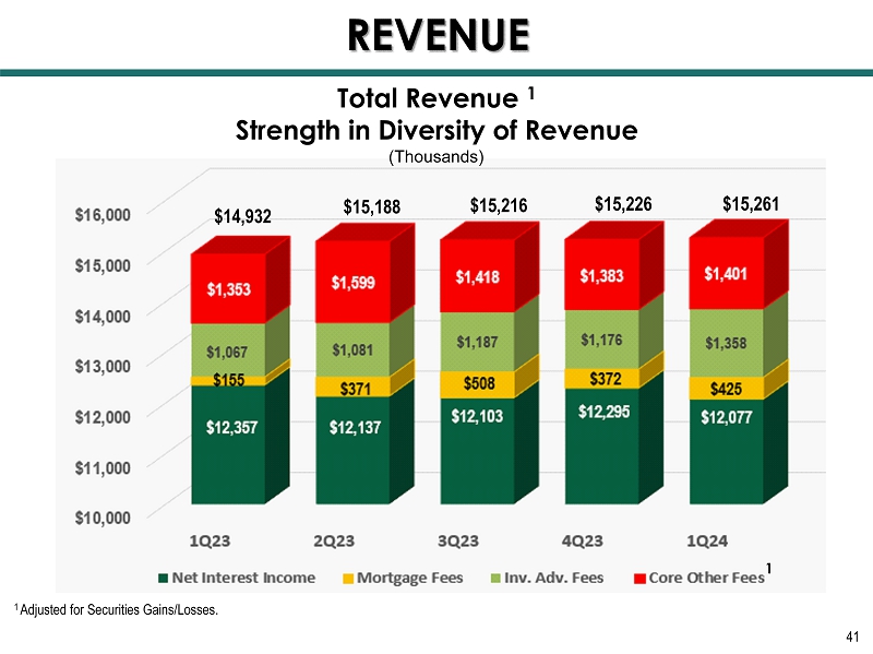 40 (Millions) $53.1 $56.2 $60.6 $59.5 Total Revenue 1, 2 Strength in Diversity of Revenue REVENUE 1 Adjusted for PPP deferred fees. 2 Adjusted for Securities Gains/Losses. 2 1