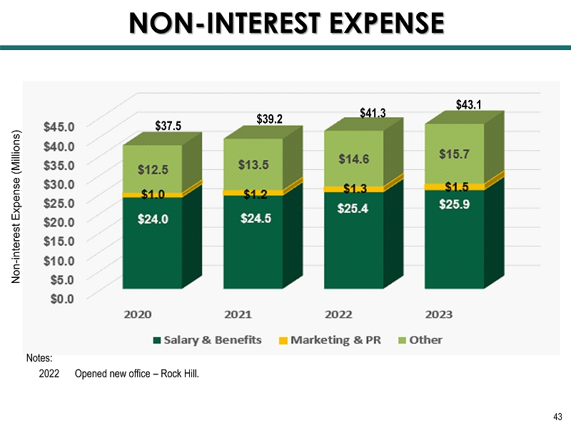 NON - INTEREST EXPENSE 43 Non - interest Expense (Millions) $37.5 $39.2 $43.1 Notes: 2022 Opened new office – Rock Hill. $41.3