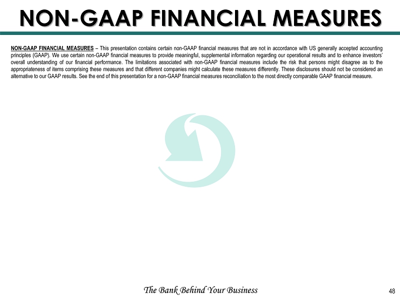 NON - GAAP FINANCIAL MEASURES The Bank Behind Your Business 48 NON - GAAP FINANCIAL MEASURES – This presentation contains certain non - GAAP financial measures that are not in accordance with US generally accepted accounting principles (GAAP) . We use certain non - GAAP financial measures to provide meaningful, supplemental information regarding our operational results and to enhance investors’ overall understanding of our financial performance . The limitations associated with non - GAAP financial measures include the risk that persons might disagree as to the appropriateness of items comprising these measures and that different companies might calculate these measures differently . These disclosures should not be considered an alternative to our GAAP results . See the end of this presentation for a non - GAAP financial measures reconciliation to the most directly comparable GAAP financial measure .