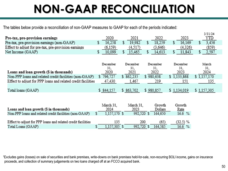 NON - GAAP RECONCILIATION 50 1 Excludes gains (losses) on sale of securities and bank premises, write - downs on bank premises held - for - sale, non - recurring BOLI income, gains on insuranc e proceeds, and collection of summary judgements on two loans charged off at an FCCO acquired bank. The tables below provide a reconciliation of non - GAAP measures to GAAP for each of the periods indicated: