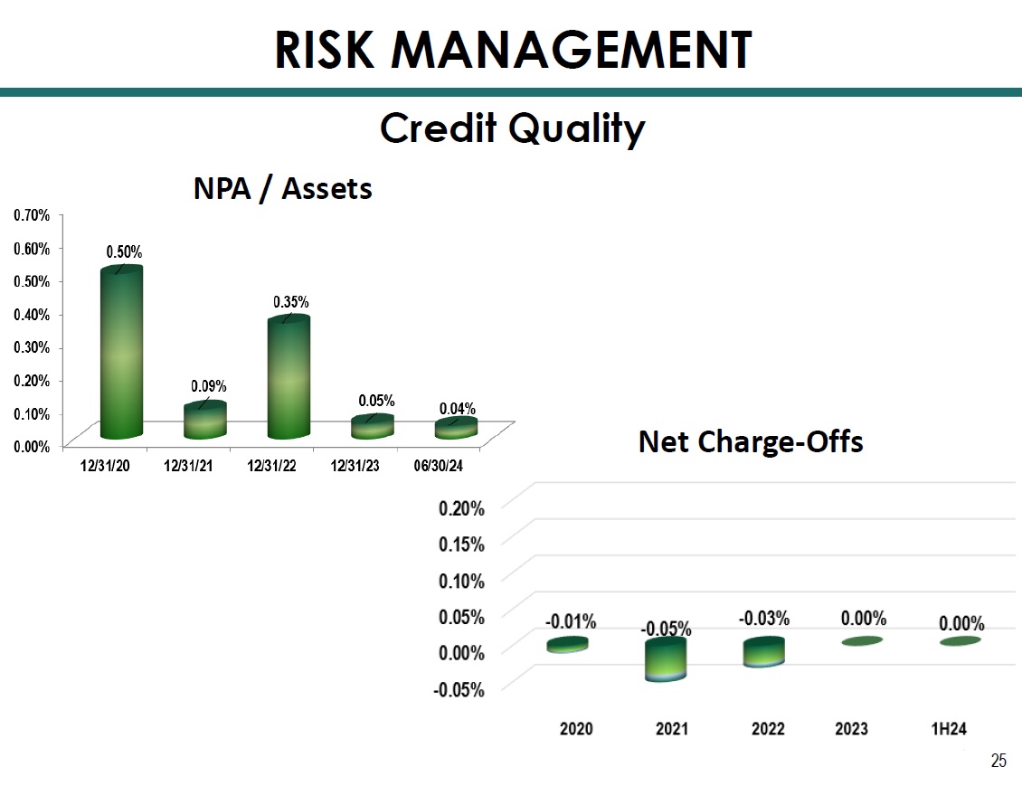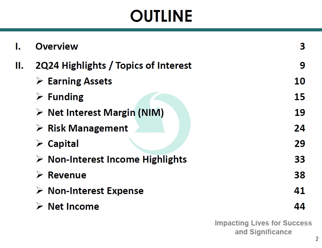 OUTLINE 2 I. Overview 3 II. 2Q24 Highlights / Topics of Interest 9 » Earning Assets 10 » Funding 15 » Net Interest Margin (NIM) 19 » Risk Management 24 » Capital 29 » Non - Interest Income Highlights 33 » Revenue 38 » Non - Interest Expense 41 » Net Income 44 Impacting Lives for Success and Significance