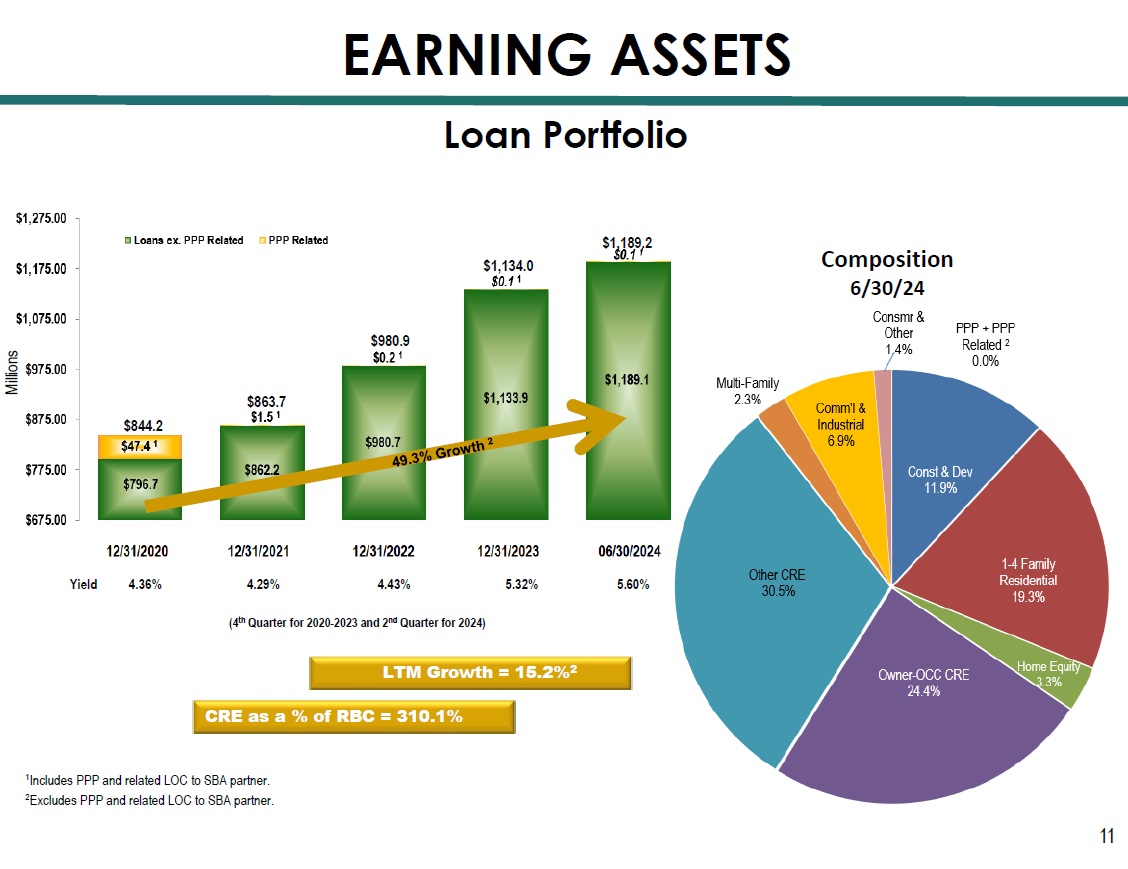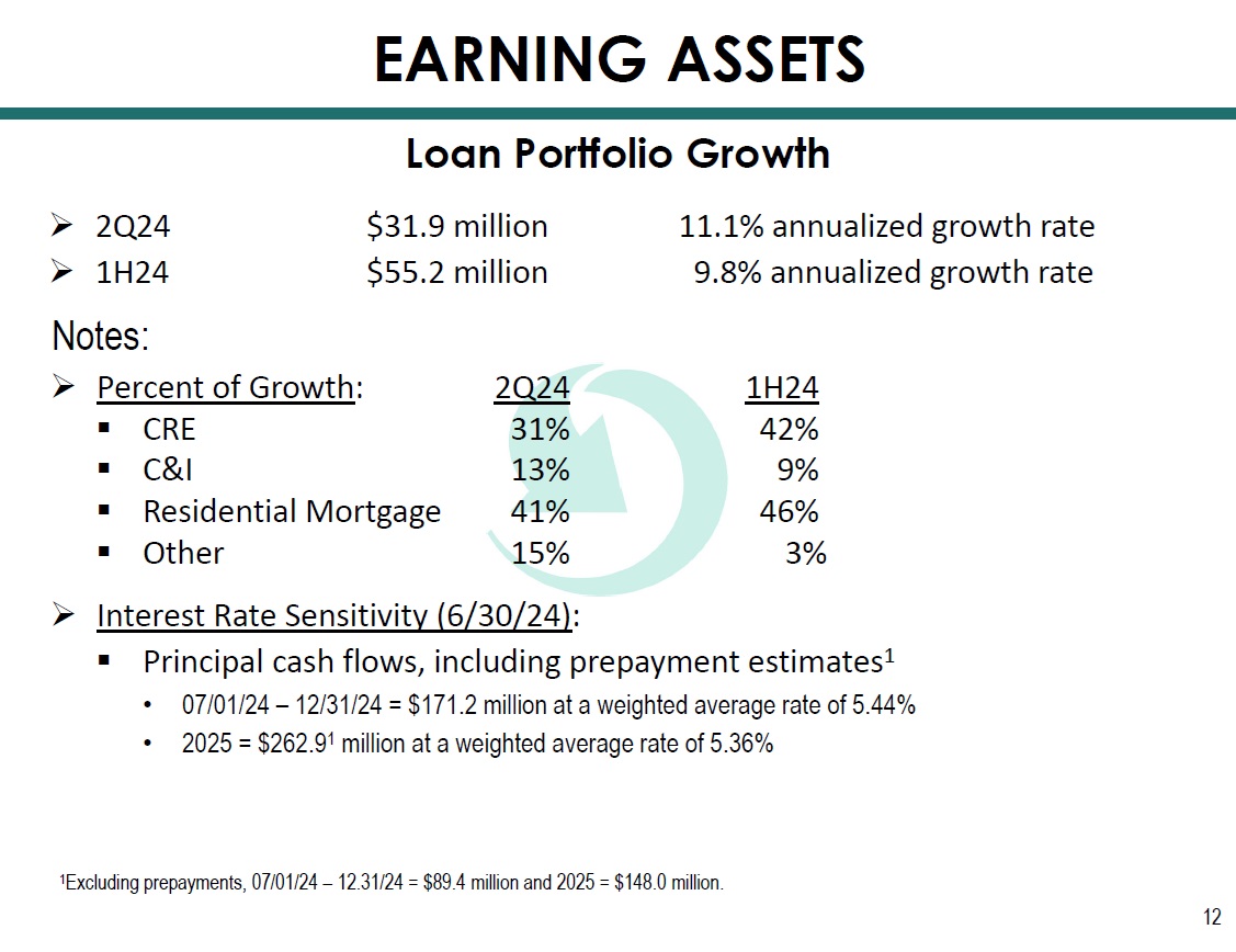 Notes: 12 1 Excluding prepayments, 07/01/24 – 12.31/24 = $89.4 million and 2025 = $148.0 million. Loan Portfolio Growth EARNING ASSETS