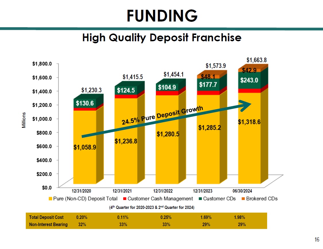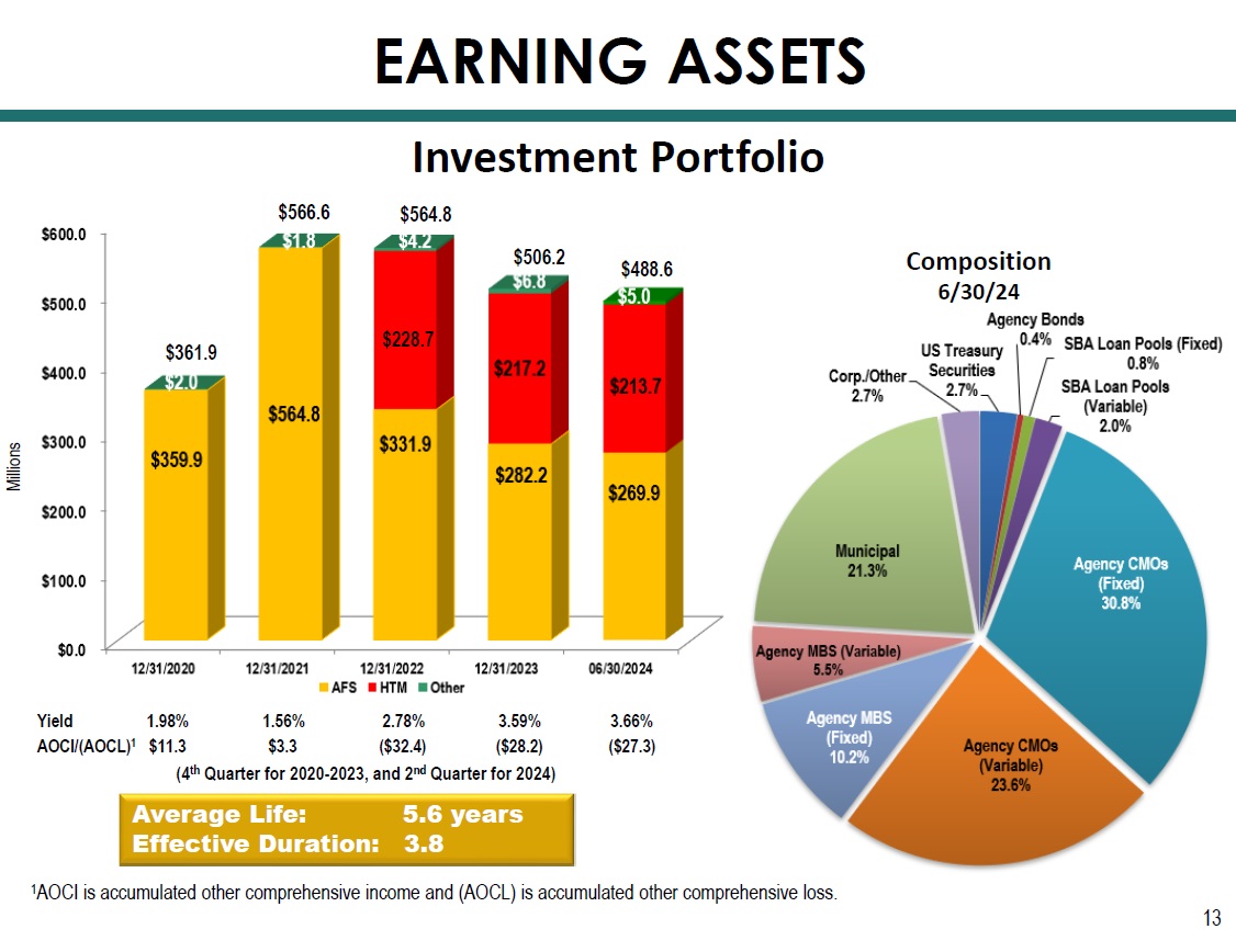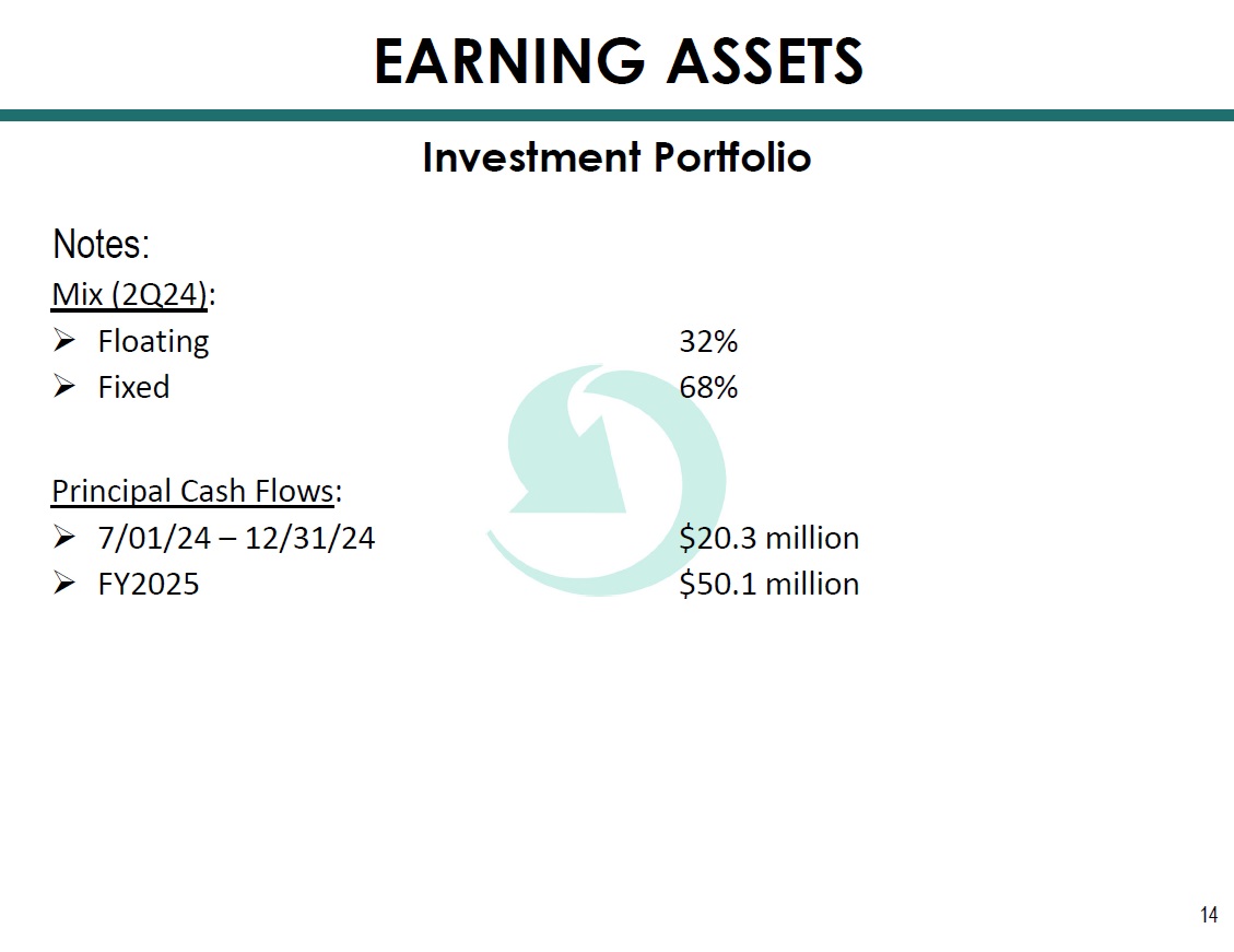 Investment Portfolio Yield 1.98% 1.56% 2.78% 3.59% 3.66% AOCI/(AOCL) 1 $11.3 $3.3 ($32.4) ($28.2) ($27.3) (4 th Quarter for 2020 - 2023, and 2 nd Quarter for 2024) Average Life: 5.6 years Effective Duration: 3.8 Composition 6/30/24 $361.9 $564.8 $506.2 EARNING ASSETS Millions $488.6 13 $566.6 1 AOCI is accumulated other comprehensive income and (AOCL) is accumulated other comprehensive loss. $228.7